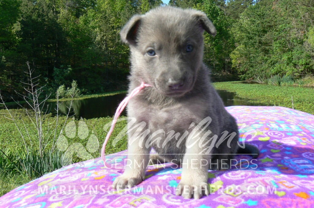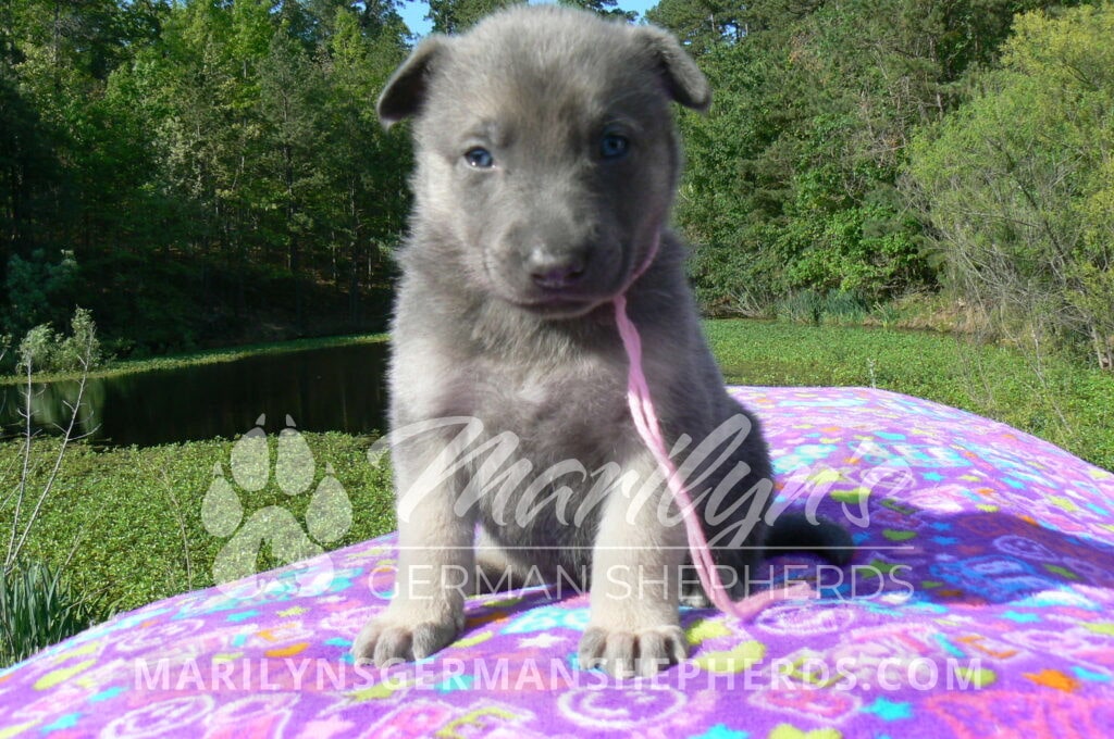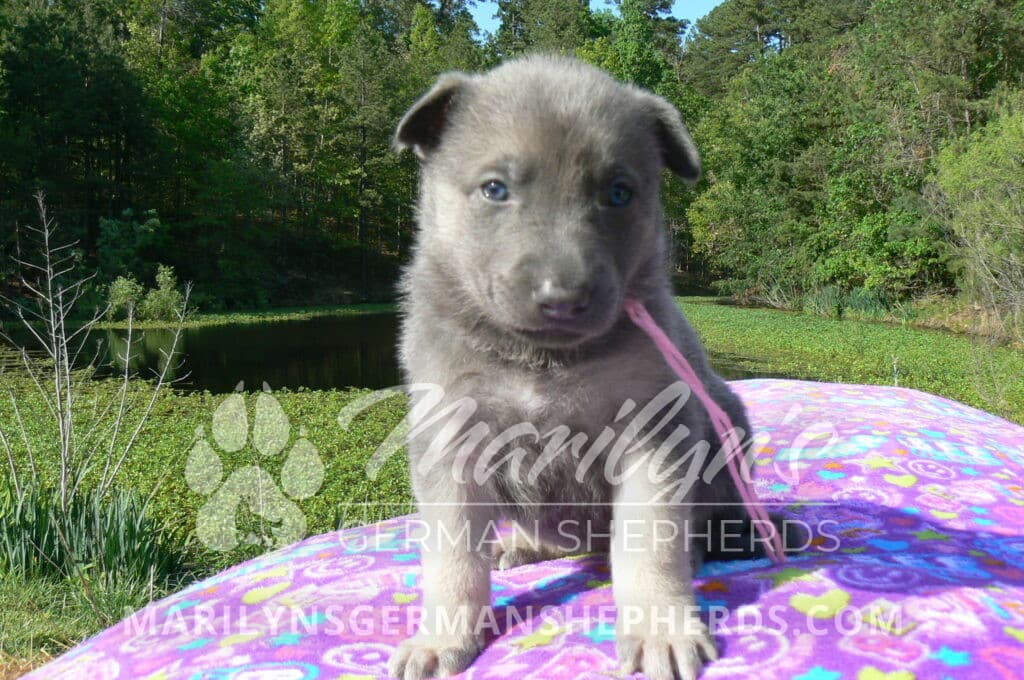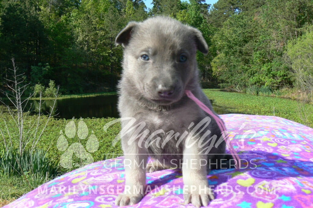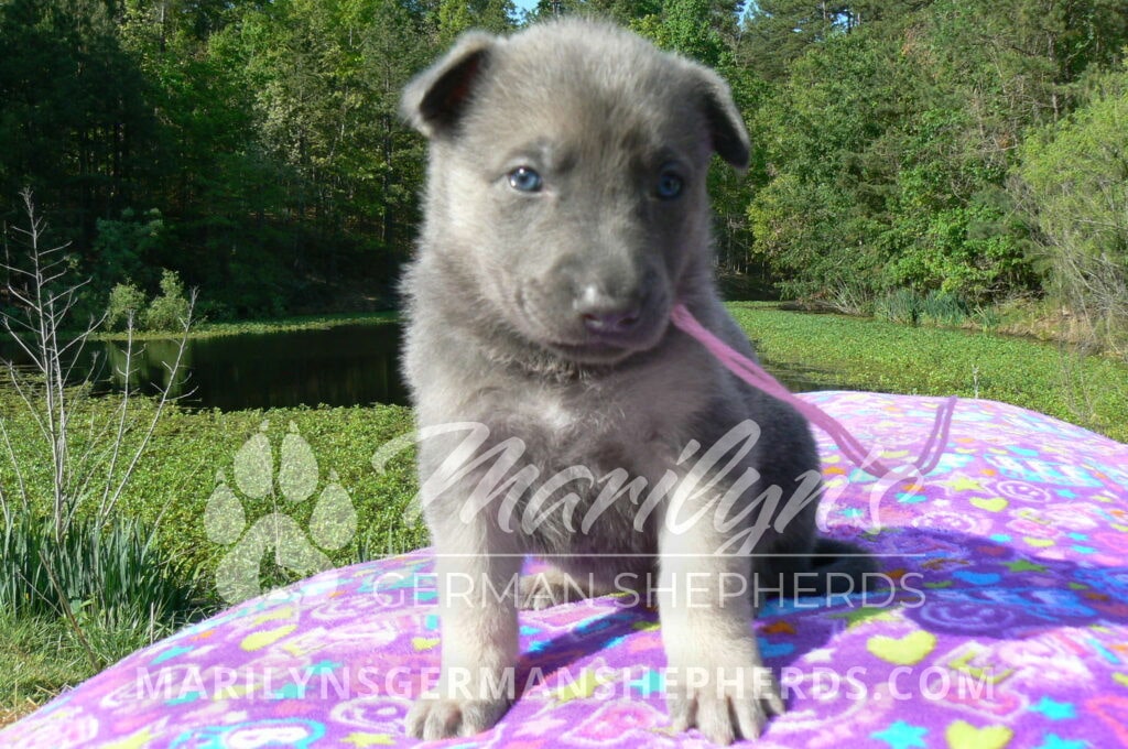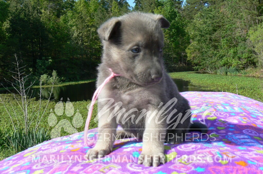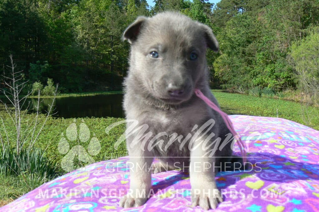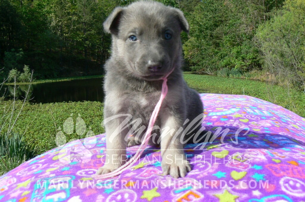 Foxy’s Miss Watermelon Bubble Gum is a beautiful blue and silver female puppy born 3-25-26, priced at $2150.00 with limited registration and a spay contract. PayPal Later is available for a puppy payment option. Her registration is AKC, American Kennel Club. She has a sweet personality. She has beautiful blue eyes. Her eyes will stay blue, or turn green, or be a light color when she is an adult. She is a short coat puppy. She is a blue and silver puppy that will keep the blue mask on her face as an adult. The blue color in a German Shepherd is a soft gray color. She is very smart. She is a very friendly, loving puppy. She likes to be picked up and loved on. She likes to play with her sister and brothers. She is adorable. Her mother is Foxy, my blue and tan mom. Her father is Vanillabean Noel, my Isabella dad. The color Isabella is liver and blue together. She has a puppy replacement health guarantee on genetic issues until one year old. Her shots and wormings are up to date and she has been vet checked. She comes with 30 days of free pet insurance on accidents and illnesses, that the new pet owner must activate. After the free 30 days you can keep the pet insurance or it will self cancel. She can be reserved for you with a $200.00 non-refundable deposit. I accept puppy payment through Paypal, cash, credit card, PayPal Later or Venmo. She is available for puppy pick up May 20th. She can be shipped. Shipping is $680.00 which includes crate, airfare and health certificate. I fly my puppies on Fridays. She will make an amazing new addition to your family.