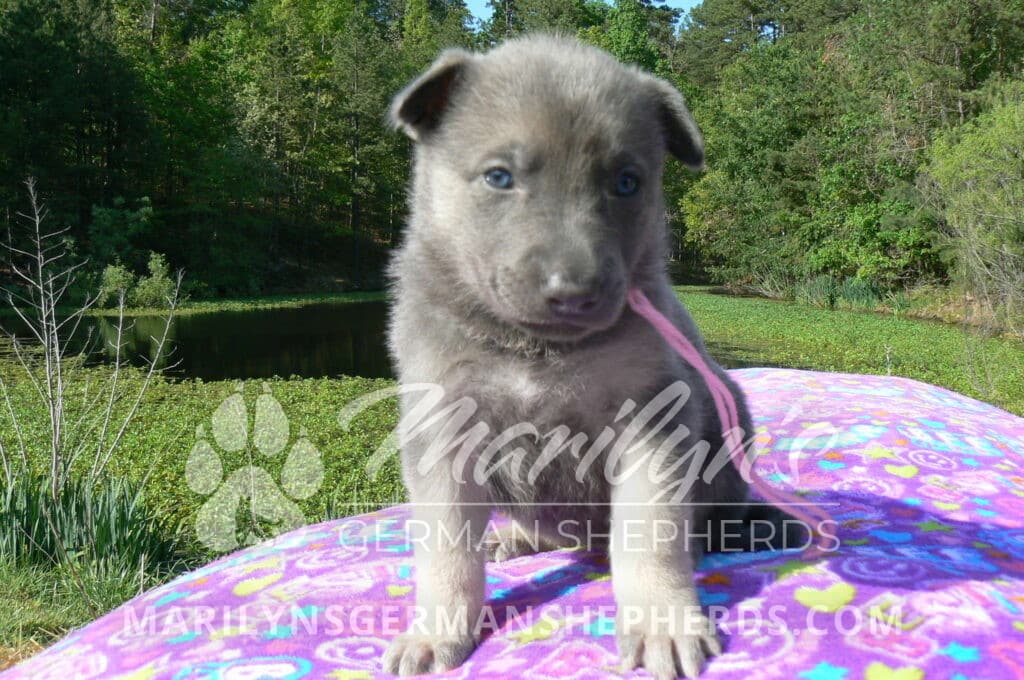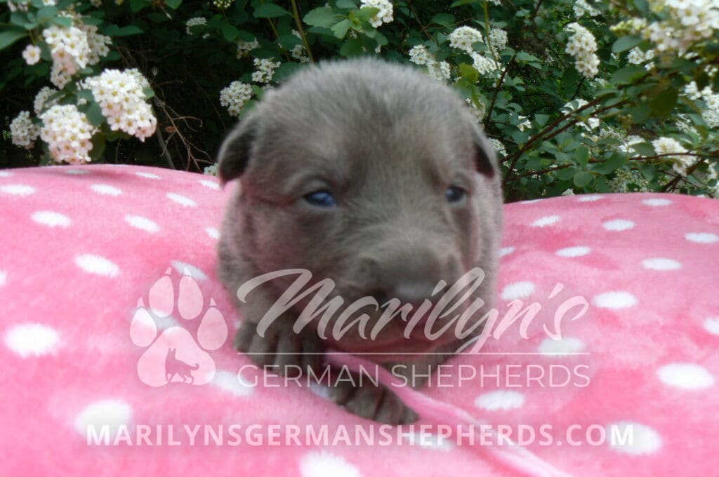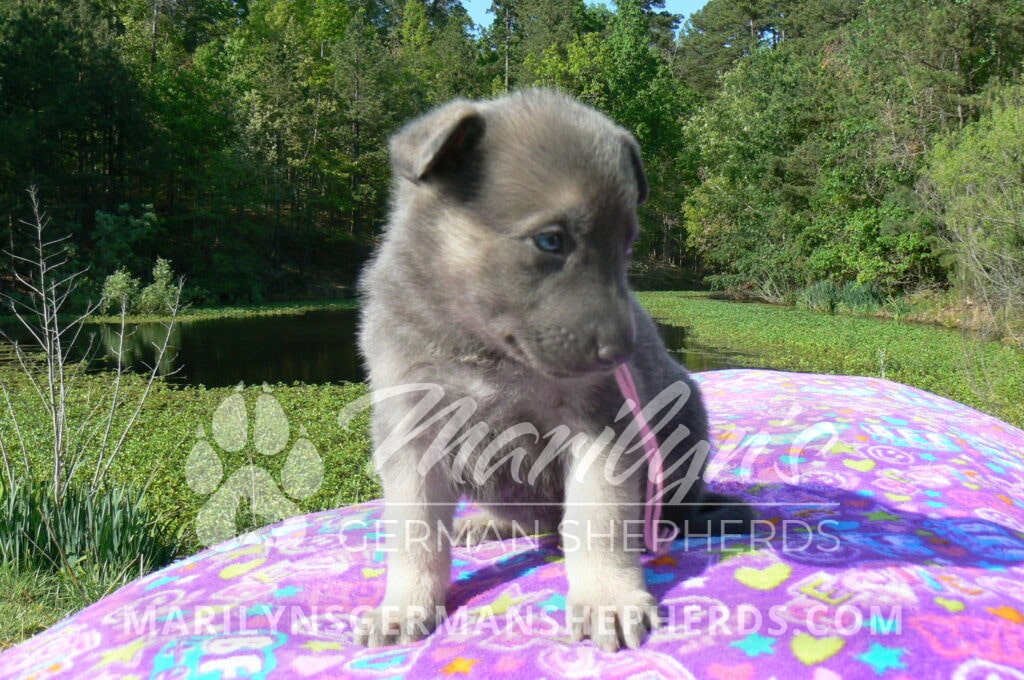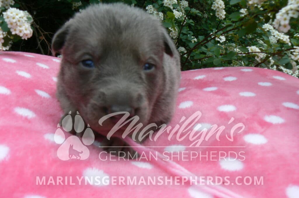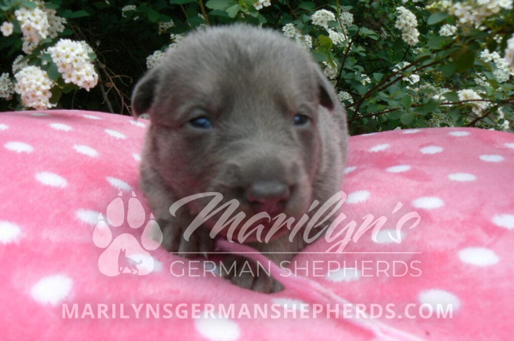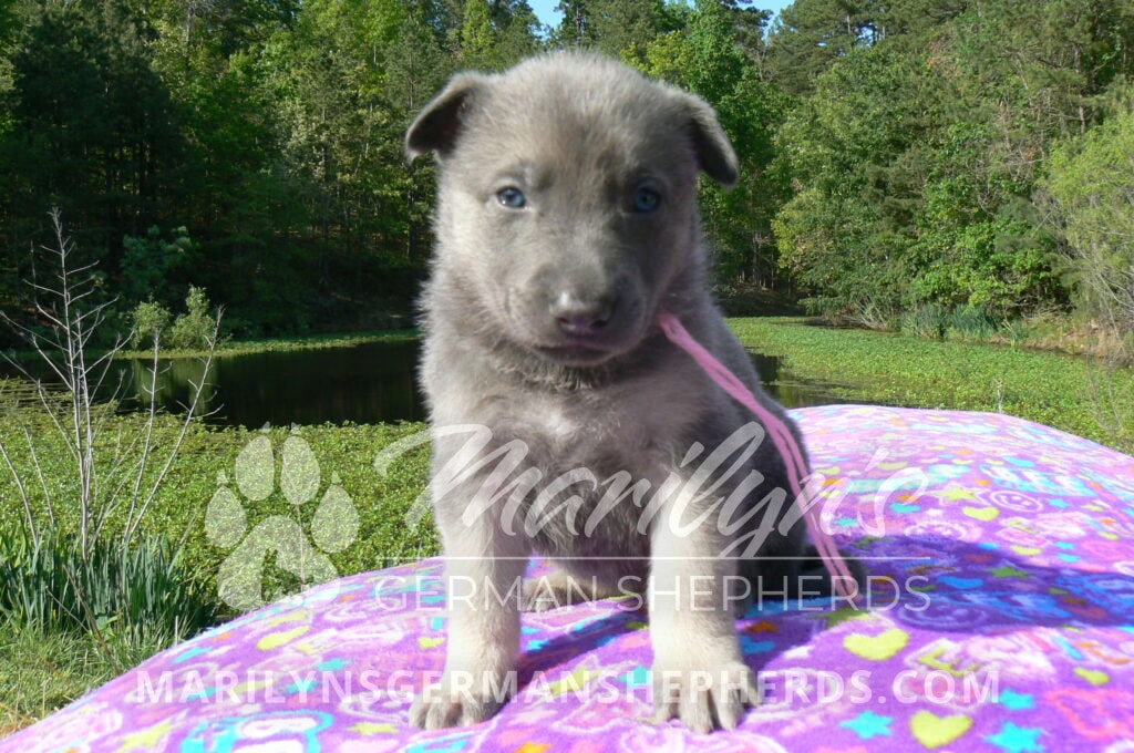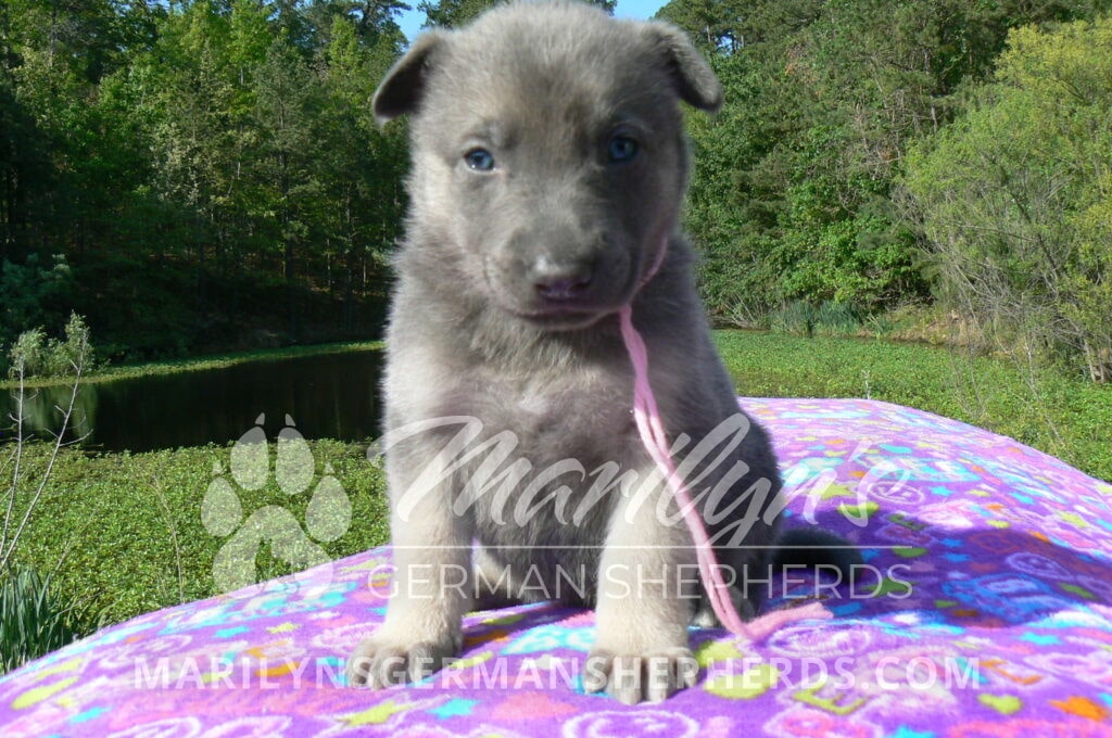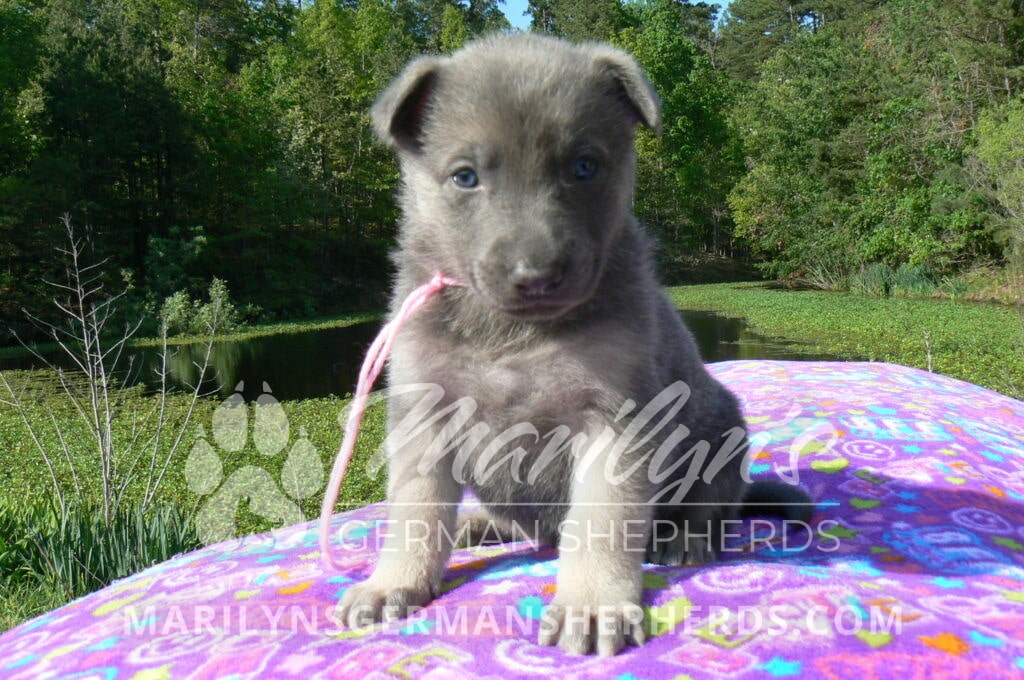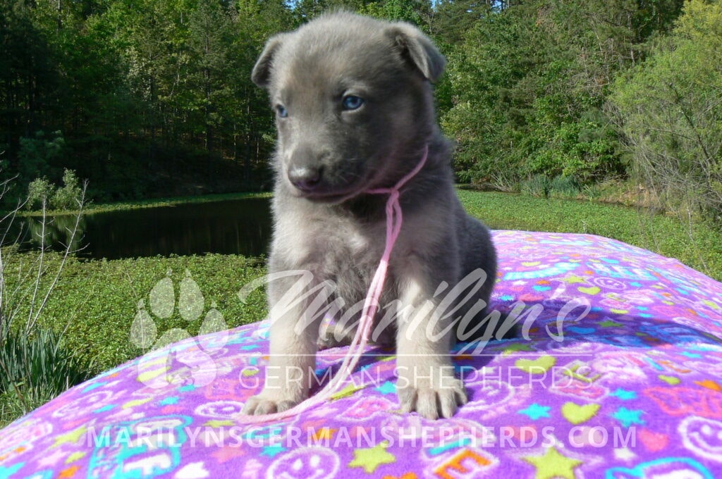 Foxy’s Miss Watermelon Bubble Gum is a beautiful blue and silver female puppy born 3-25-26, priced at $2150.00 with limited registration and a spay contract. PayPal Later is available for a puppy payment option. Her registration is AKC, American Kennel Club. She has a sweet personality. She has beautiful blue eyes. Her eyes will stay blue, or turn green, or be a light color when she is an adult. She is a short coat puppy. She is a blue and silver puppy that will keep the blue mask on her face as an adult. The blue color in a German Shepherd is a soft gray color. She is very smart. She is a very friendly, loving puppy. She likes to be picked up and loved on. She likes to play with her sister and brothers. She is adorable. Her mother is Foxy, my blue and tan mom. Her father is Vanillabean Noel, my Isabella dad. The color Isabella is liver and blue together. She has a puppy replacement health guarantee on genetic issues until one year old. Her shots and wormings are up to date and she has been vet checked. She comes with 30 days of free pet insurance on accidents and illnesses, that the new pet owner must activate. After the free 30 days you can keep the pet insurance or it will self cancel. She can be reserved for you with a $200.00 non-refundable deposit. I accept puppy payment through Paypal, cash, credit card, PayPal Later or Venmo. She is available for puppy pick up May 20th. She can be shipped. Shipping is $680.00 which includes crate, airfare and health certificate. I fly my puppies on Fridays. She will make an amazing new addition to your family.