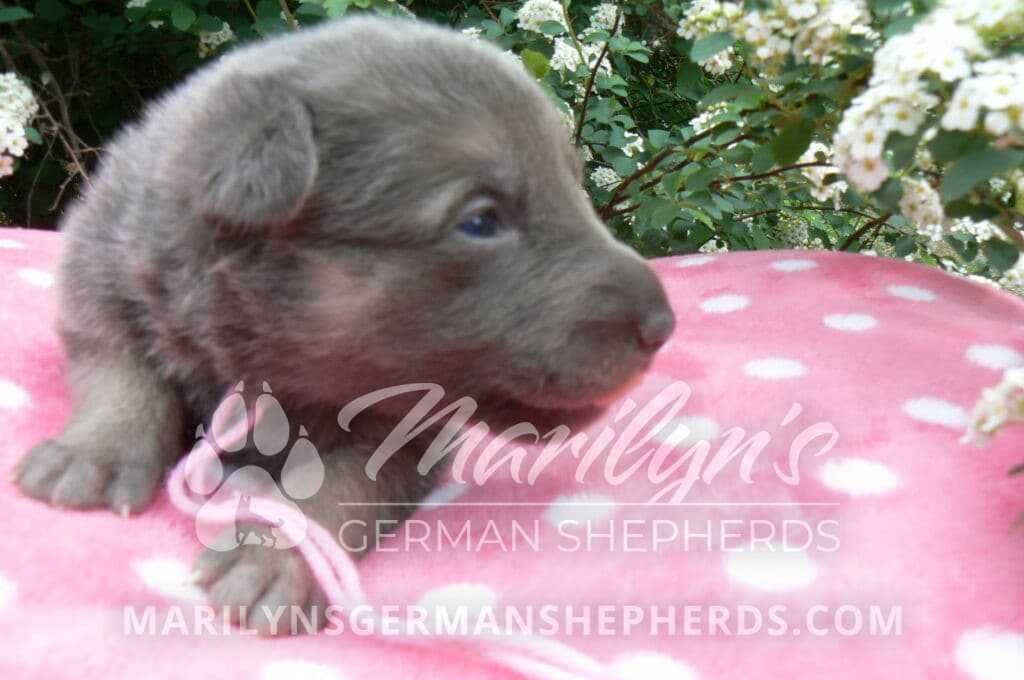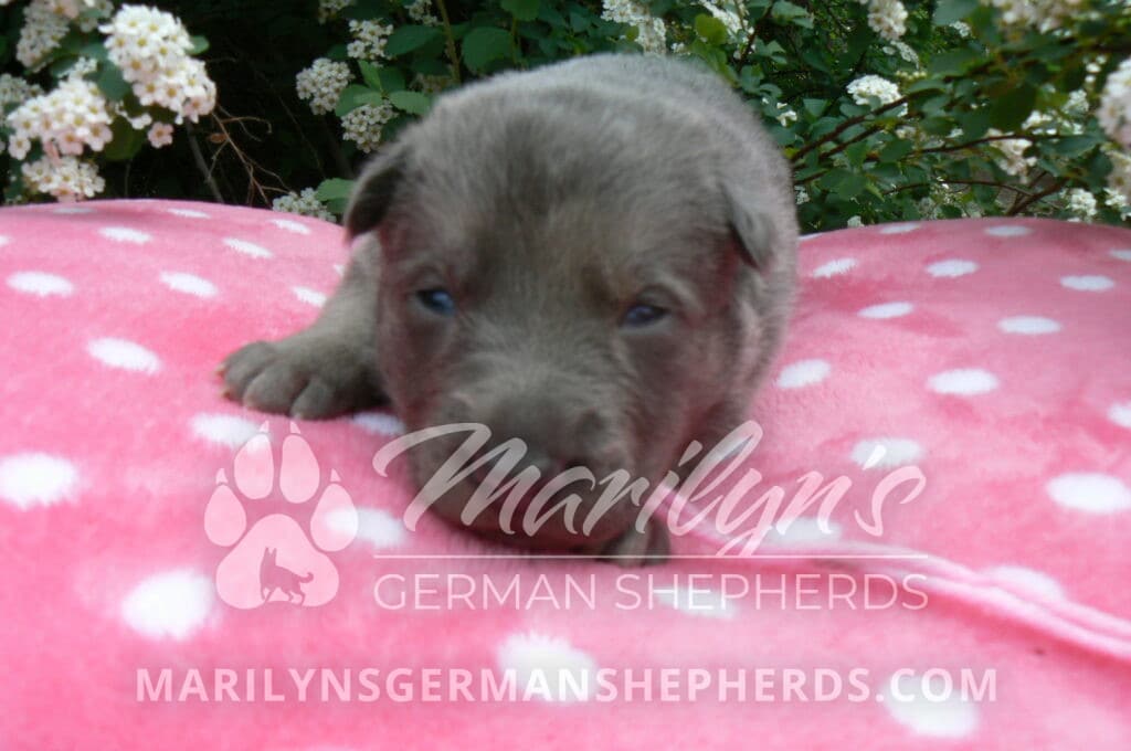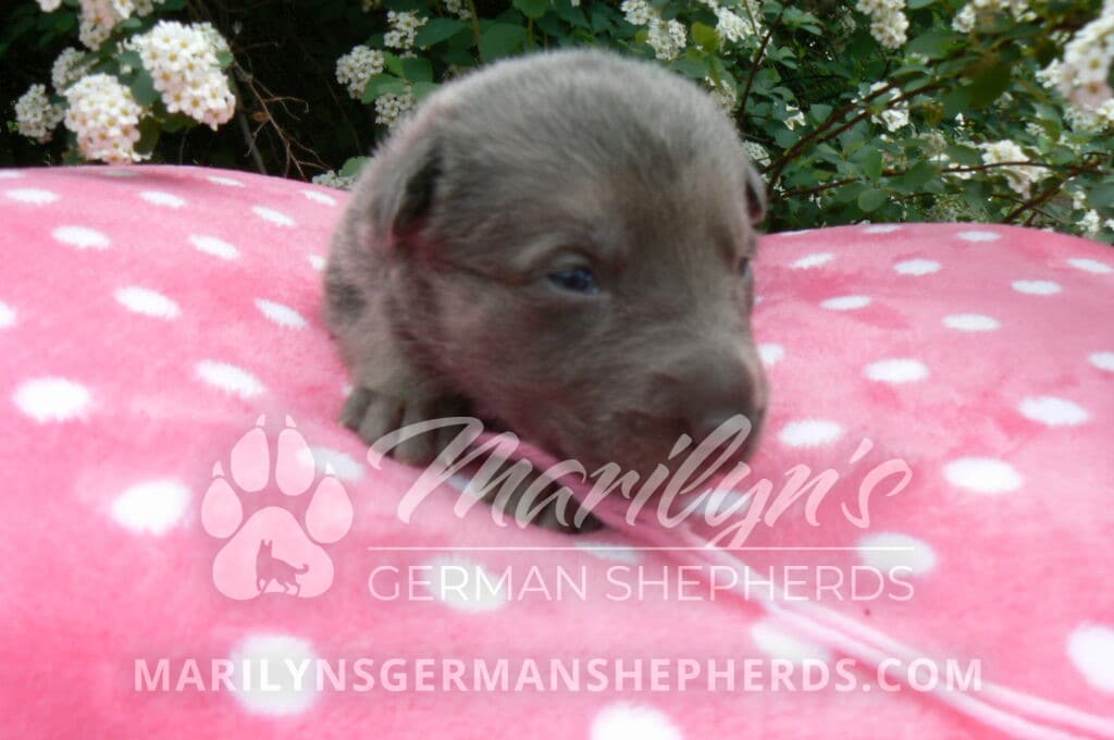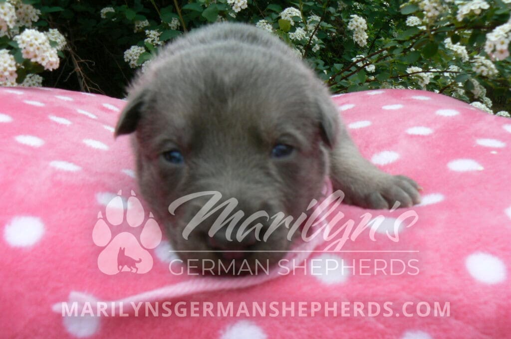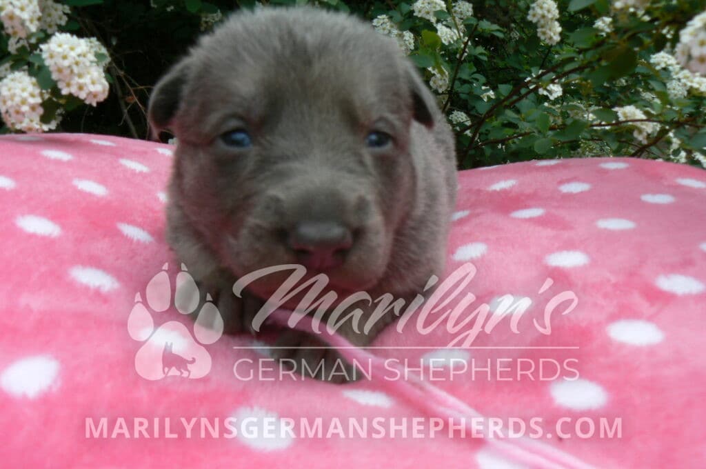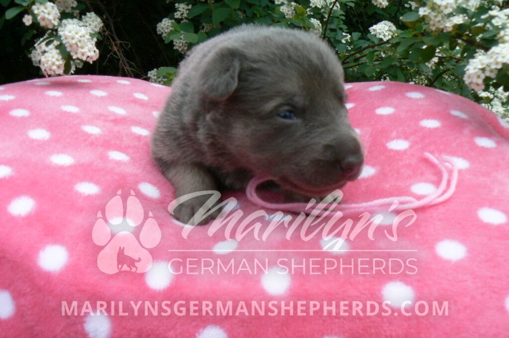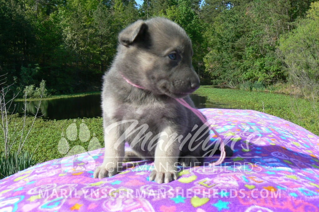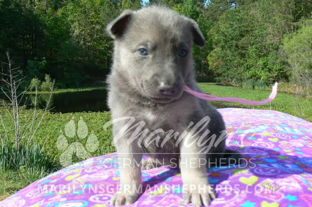 Foxy’s Miss Watermelon Bubble Gum is a beautiful blue and silver female puppy born 3-25-26, priced at $2150.00 with limited registration and a spay contract. PayPal Later is available for a puppy payment option. Her registration is AKC, American Kennel Club. She has a sweet personality. She has beautiful blue eyes. Her eyes will stay blue, or turn green, or be a light color when she is an adult. She is a short coat puppy. She is a blue and silver puppy that will keep the blue mask on her face as an adult. The blue color in a German Shepherd is a soft gray color. She is very smart. She is a very friendly, loving puppy. She likes to be picked up and loved on. She likes to play with her sister and brothers. She is adorable. Her mother is Foxy, my blue and tan mom. Her father is Vanillabean Noel, my Isabella dad. The color Isabella is liver and blue together. She has a puppy replacement health guarantee on genetic issues until one year old. Her shots and wormings are up to date and she has been vet checked. She comes with 30 days of free pet insurance on accidents and illnesses, that the new pet owner must activate. After the free 30 days you can keep the pet insurance or it will self cancel. She can be reserved for you with a $200.00 non-refundable deposit. I accept puppy payment through Paypal, cash, credit card, PayPal Later or Venmo. She is available for puppy pick up May 20th. She can be shipped. Shipping is $680.00 which includes crate, airfare and health certificate. I fly my puppies on Fridays. She will make an amazing new addition to your family.
