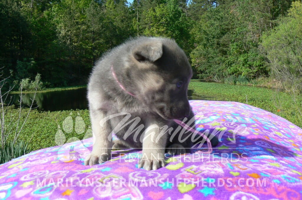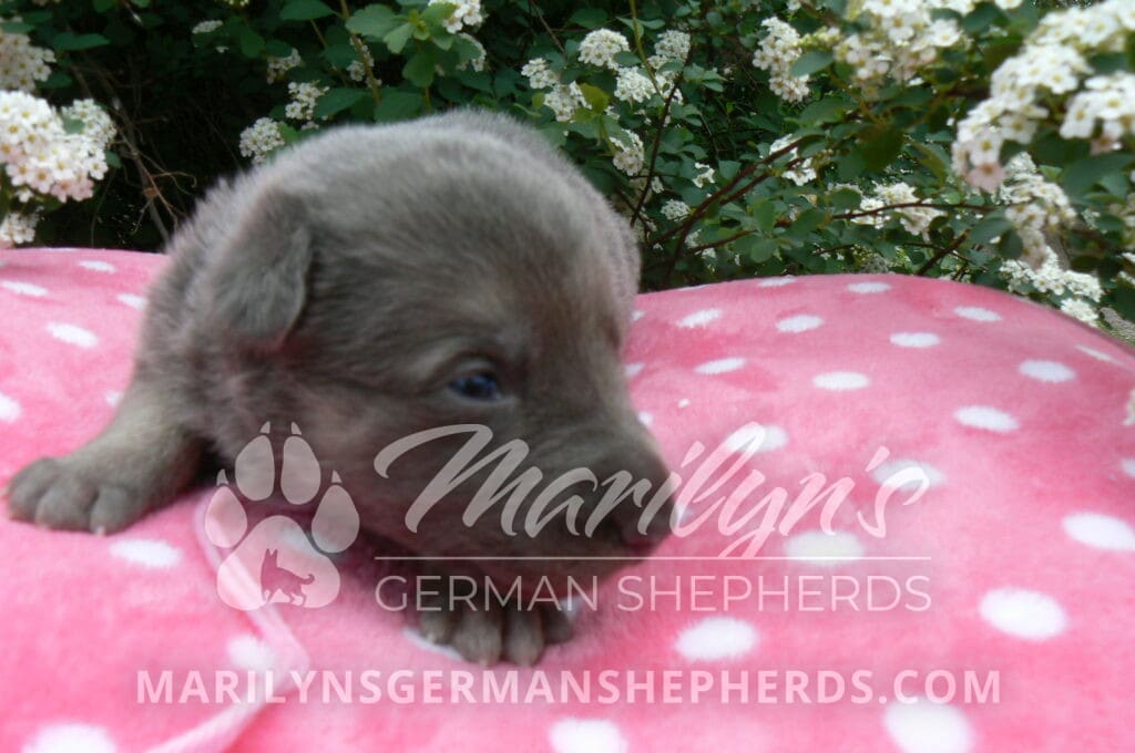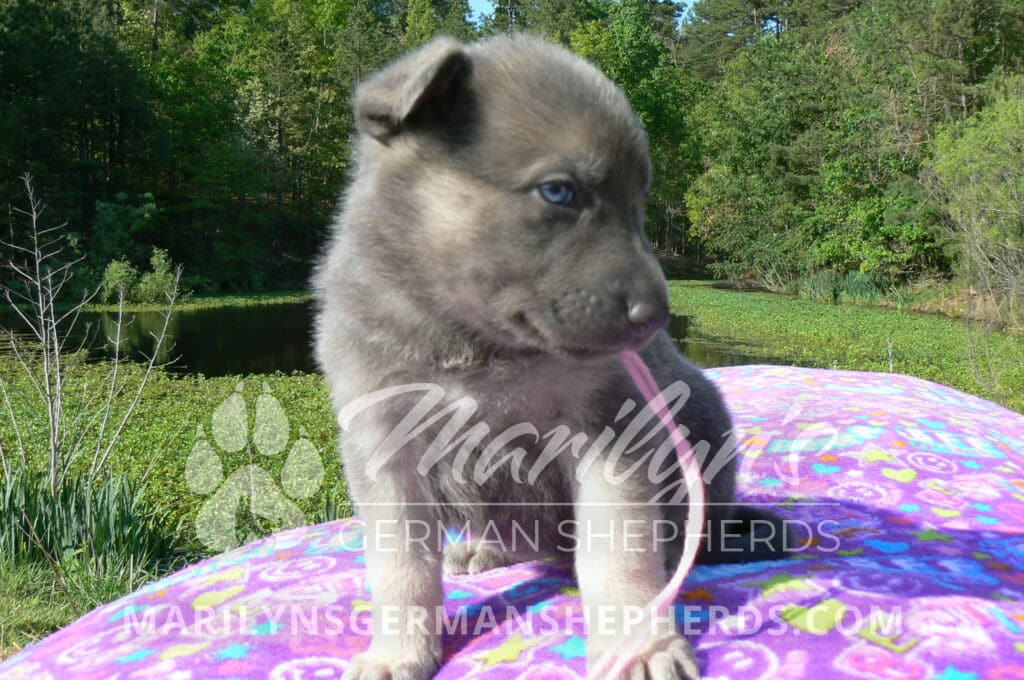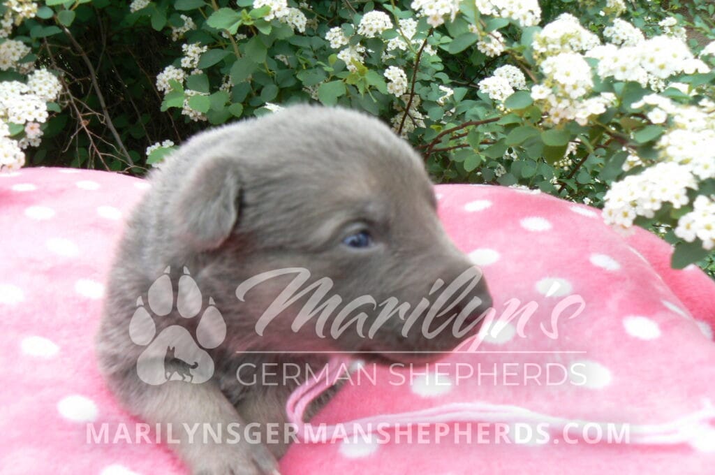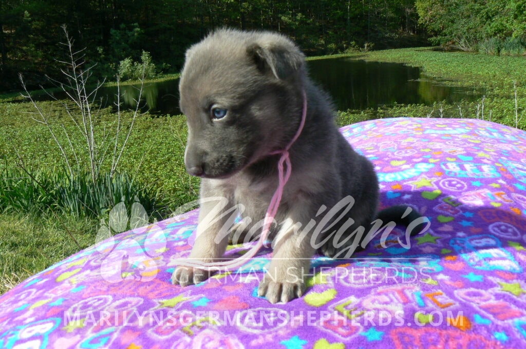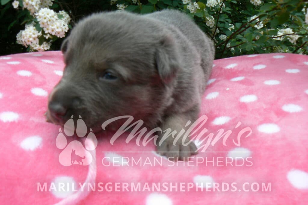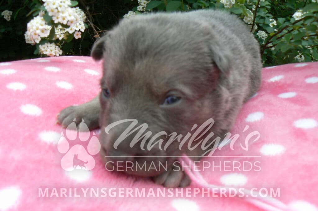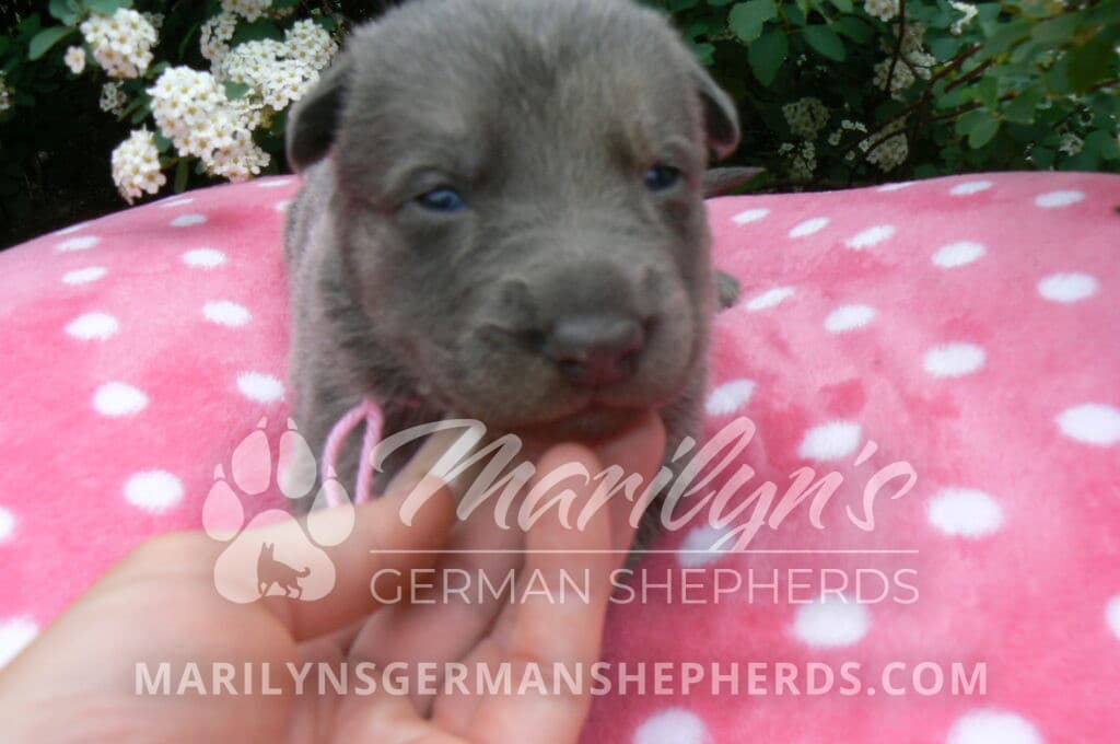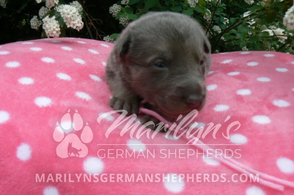 Foxy’s Miss Watermelon Bubble Gum is a beautiful blue and silver female puppy born 3-25-26, priced at $2150.00 with limited registration and a spay contract. PayPal Later is available for a puppy payment option. Her registration is AKC, American Kennel Club. She has a sweet personality. She has beautiful blue eyes. Her eyes will stay blue, or turn green, or be a light color when she is an adult. She is a short coat puppy. She is a blue and silver puppy that will keep the blue mask on her face as an adult. The blue color in a German Shepherd is a soft gray color. She is very smart. She is a very friendly, loving puppy. She likes to be picked up and loved on. She likes to play with her sister and brothers. She is adorable. Her mother is Foxy, my blue and tan mom. Her father is Vanillabean Noel, my Isabella dad. The color Isabella is liver and blue together. She has a puppy replacement health guarantee on genetic issues until one year old. Her shots and wormings are up to date and she has been vet checked. She comes with 30 days of free pet insurance on accidents and illnesses, that the new pet owner must activate. After the free 30 days you can keep the pet insurance or it will self cancel. She can be reserved for you with a $200.00 non-refundable deposit. I accept puppy payment through Paypal, cash, credit card, PayPal Later or Venmo. She is available for puppy pick up May 20th. She can be shipped. Shipping is $680.00 which includes crate, airfare and health certificate. I fly my puppies on Fridays. She will make an amazing new addition to your family.