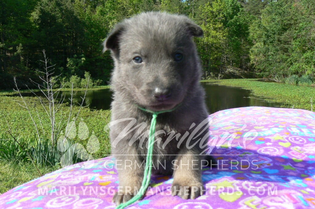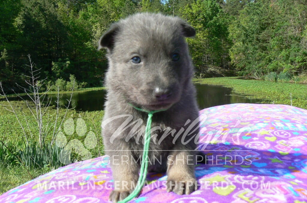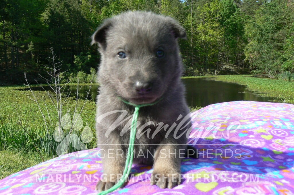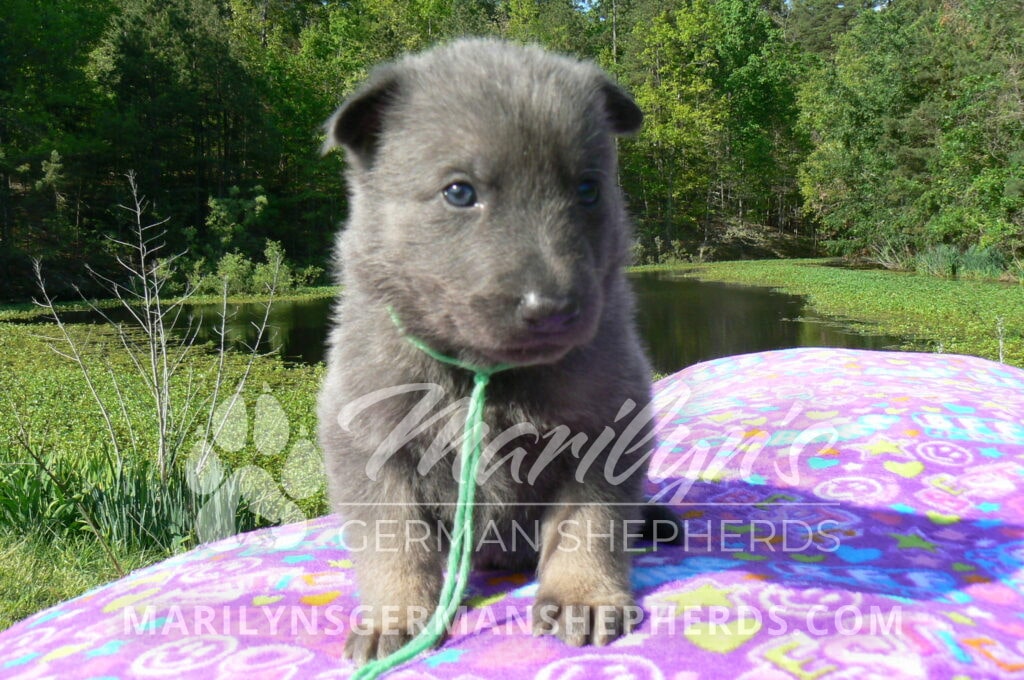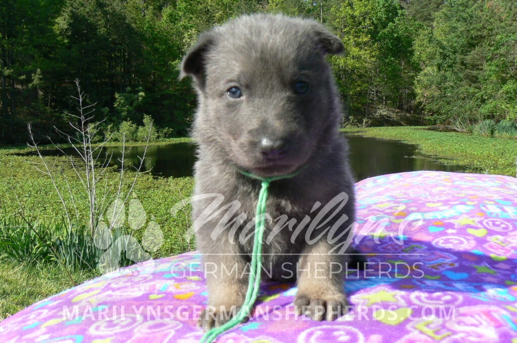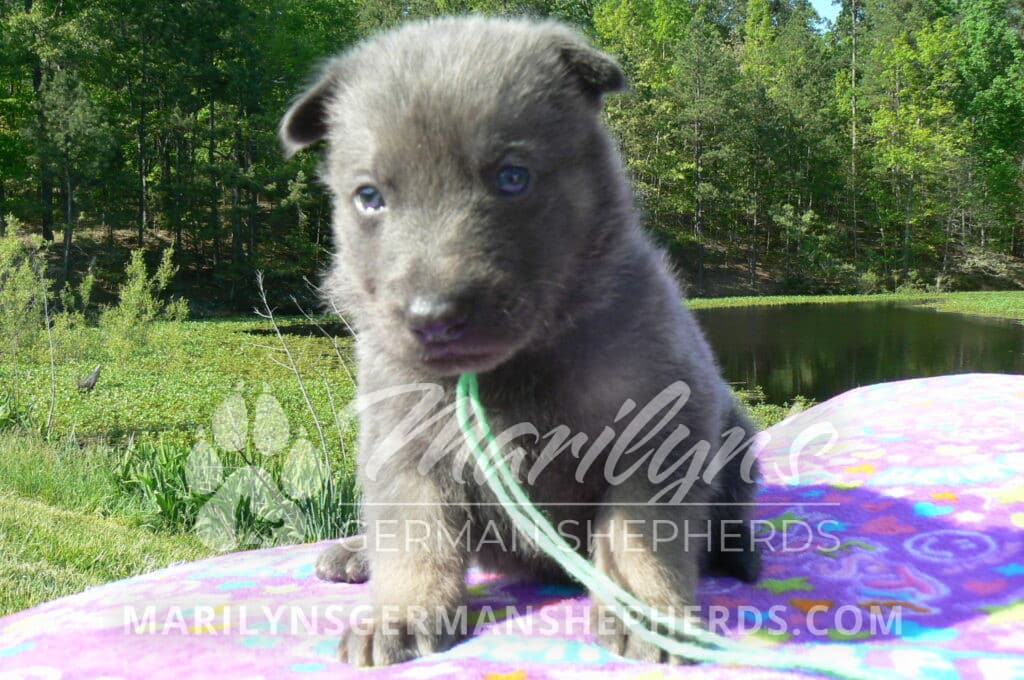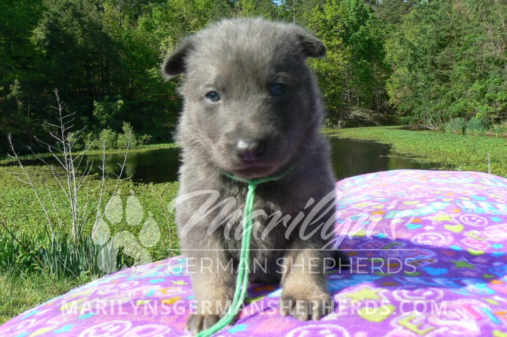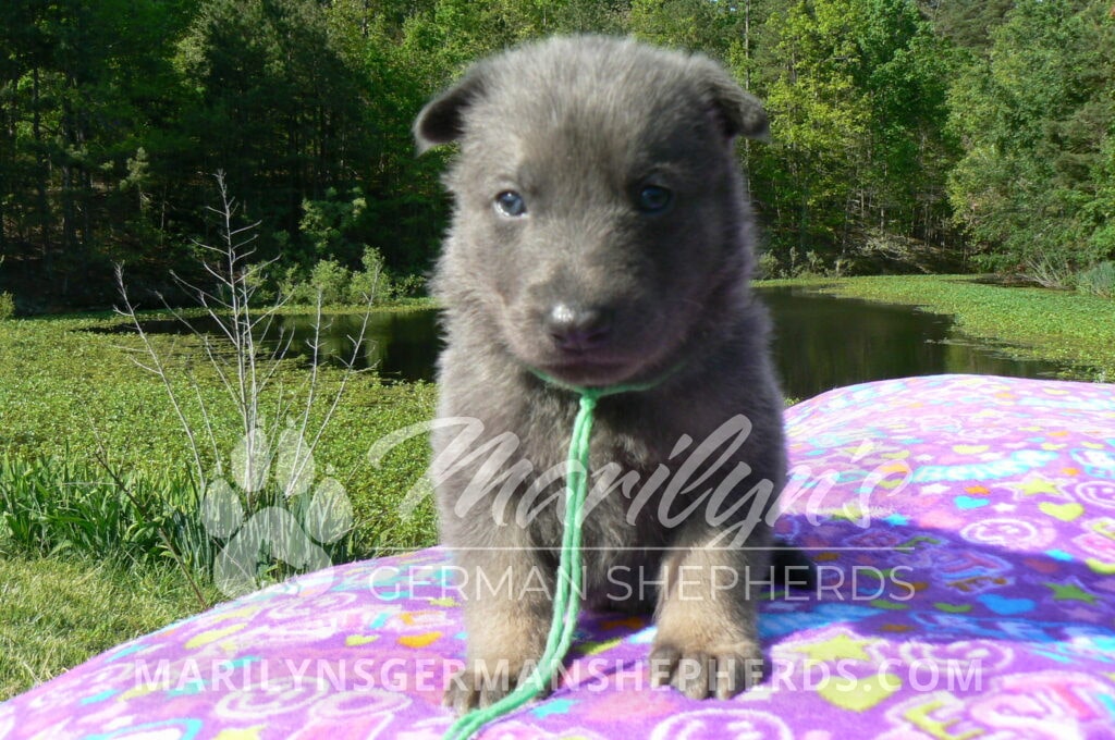 Foxy’s Mr. Key Lime Cake Pop is a blue and silver male puppy born 3-25-26, priced at $2150.00 with limited registration and a neuter contract. He has the option of PayPal Later payment plan through my website. His registration is AKC, American Kennel Club. He has a calm personality. He is a sweet boy that likes to cuddle. He has blue eyes. As an adult his eyes will stay blue or turn green or a gold hazel color. He is a very friendly puppy. He enjoys attention. He likes to play with his brothers and sisters. He has a soft short blue and silver coat. The color blue on a German Shepherd is a soft gray color. He is a short coat puppy. He is very alert and smart. He likes to be with people. He is a wonderful German Shepherd puppy. His mother is Foxy, my blue and tan mom. His father is Vanillabean Noel, my Isabella dad. The color Isabella is liver and blue together. He has a puppy replacement health guarantee on genetic issues until one year old. His shots and wormings are up to date and he has been vet checked. He comes with 30 days of pet insurance free for accidents and illnesses, that the new pet owner must activate. After the free 30 days you can keep the pet insurance or it will self cancel. He can be reserved for you with a $200.00 non-refundable deposit. I accept puppy payment through Paypal, cash, credit card, or Venmo. He is available for puppy pick up May 20th. He can be shipped. Shipping is an additional cost of $680.00 which includes crate, airfare, and health certificate. I fly my puppies on Fridays. He will make an amazing new addition to your family.