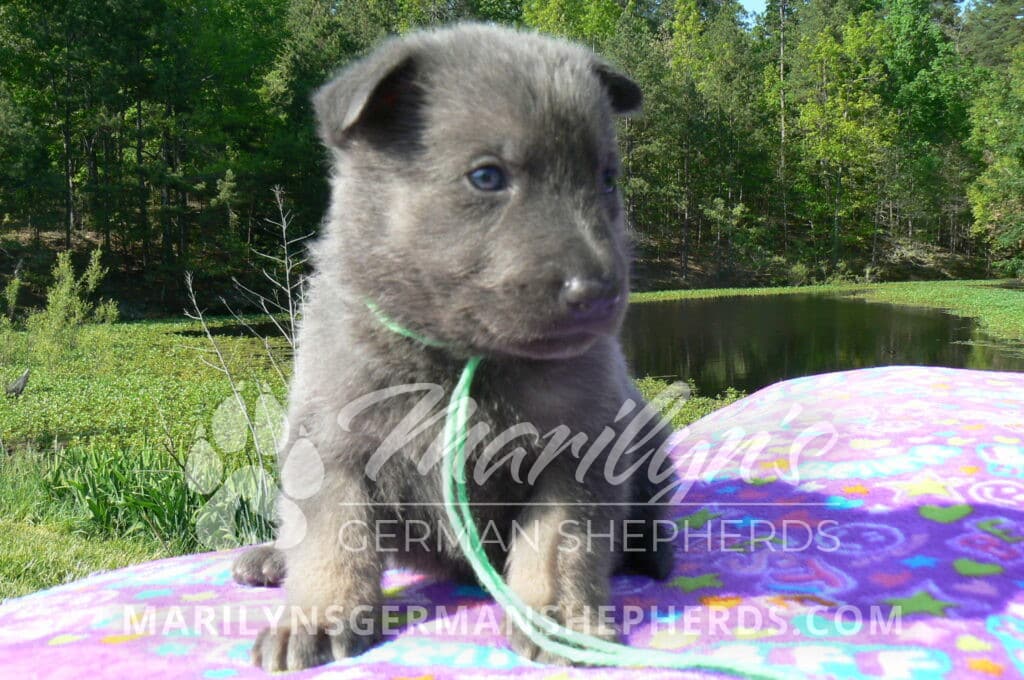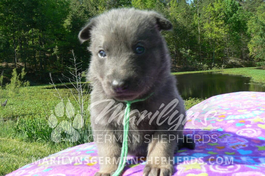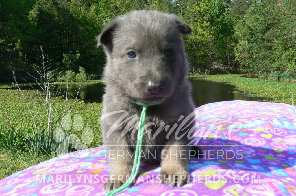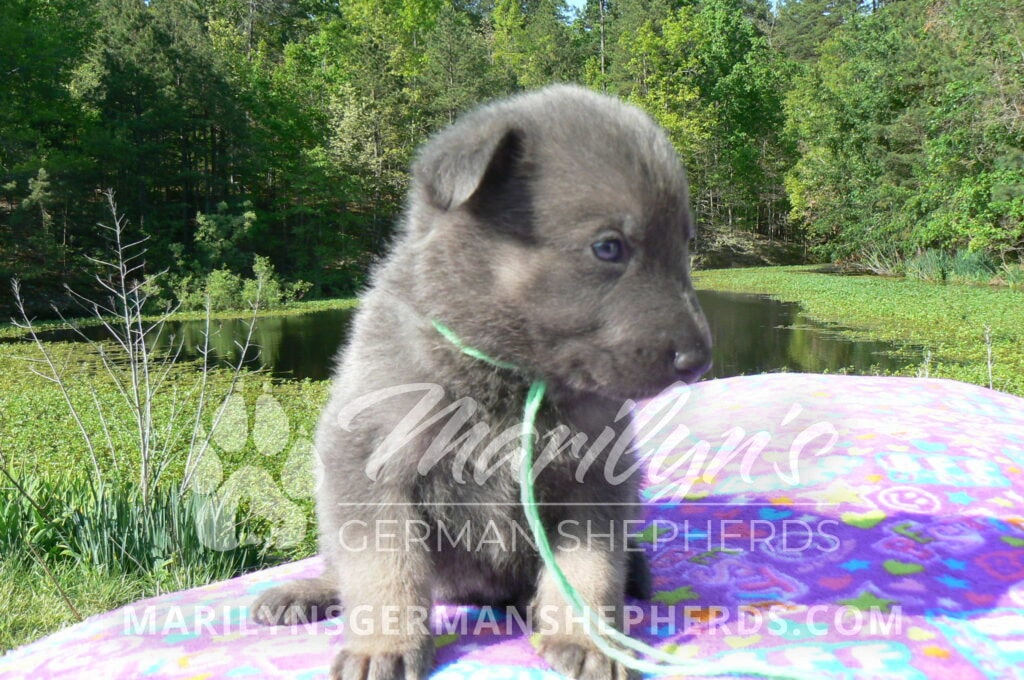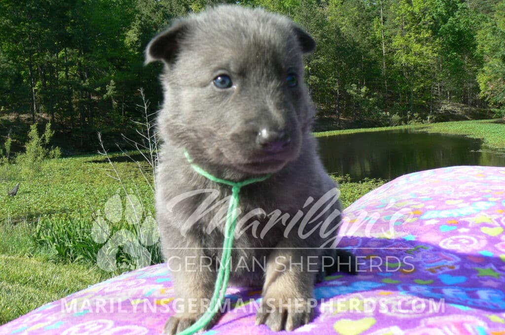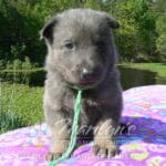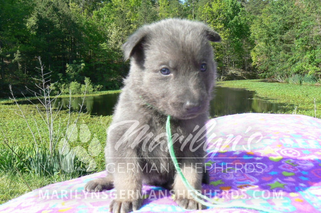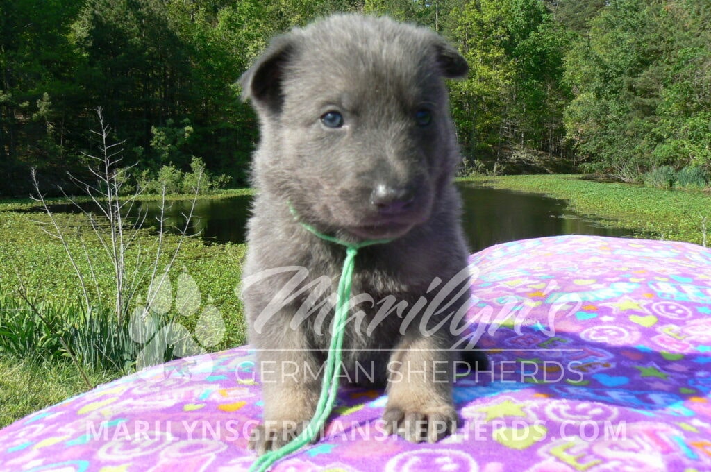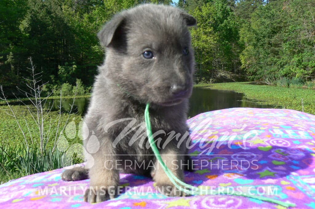 Foxy’s Mr. Key Lime Cake Pop is a blue and silver male puppy born 3-25-26, priced at $2150.00 with limited registration and a neuter contract. He has the option of PayPal Later payment plan through my website. His registration is AKC, American Kennel Club. He has a calm personality. He is a sweet boy that likes to cuddle. He has blue eyes. As an adult his eyes will stay blue or turn green or a gold hazel color. He is a very friendly puppy. He enjoys attention. He likes to play with his brothers and sisters. He has a soft short blue and silver coat. The color blue on a German Shepherd is a soft gray color. He is a short coat puppy. He is very alert and smart. He likes to be with people. He is a wonderful German Shepherd puppy. His mother is Foxy, my blue and tan mom. His father is Vanillabean Noel, my Isabella dad. The color Isabella is liver and blue together. He has a puppy replacement health guarantee on genetic issues until one year old. His shots and wormings are up to date and he has been vet checked. He comes with 30 days of pet insurance free for accidents and illnesses, that the new pet owner must activate. After the free 30 days you can keep the pet insurance or it will self cancel. He can be reserved for you with a $200.00 non-refundable deposit. I accept puppy payment through Paypal, cash, credit card, or Venmo. He is available for puppy pick up May 20th. He can be shipped. Shipping is an additional cost of $680.00 which includes crate, airfare, and health certificate. I fly my puppies on Fridays. He will make an amazing new addition to your family.