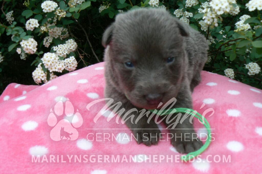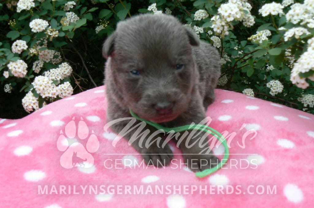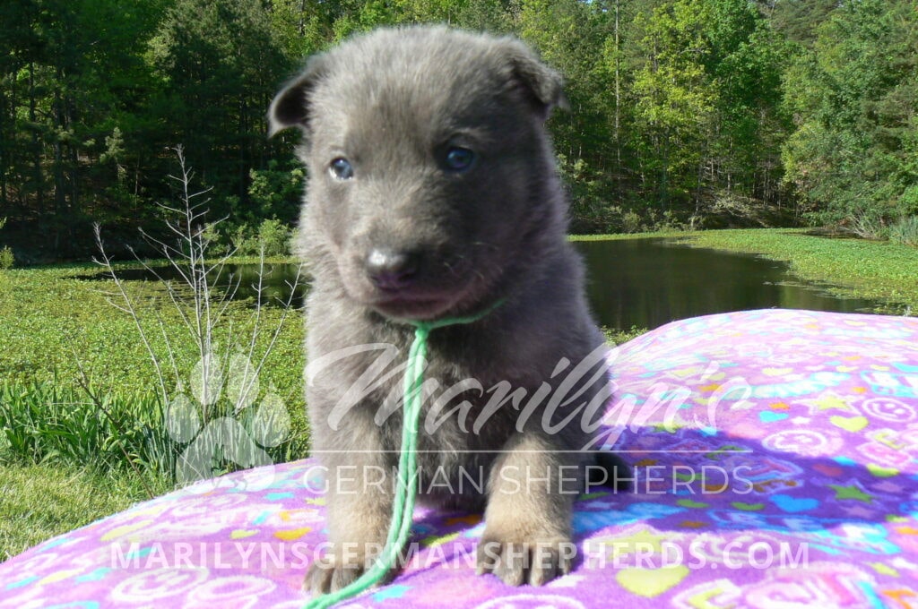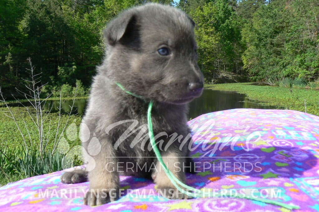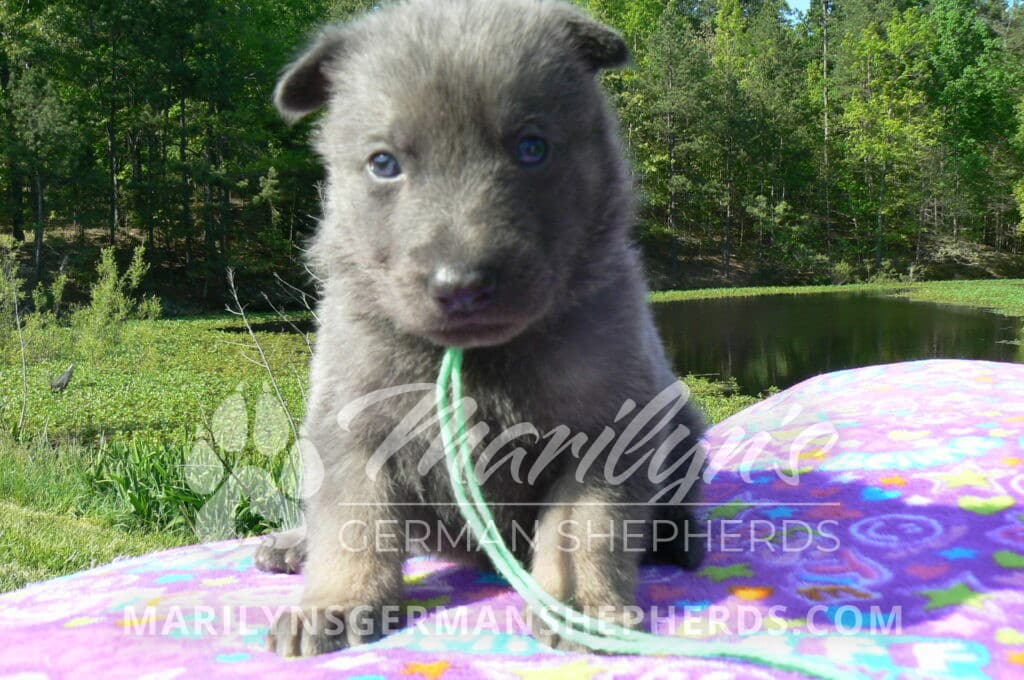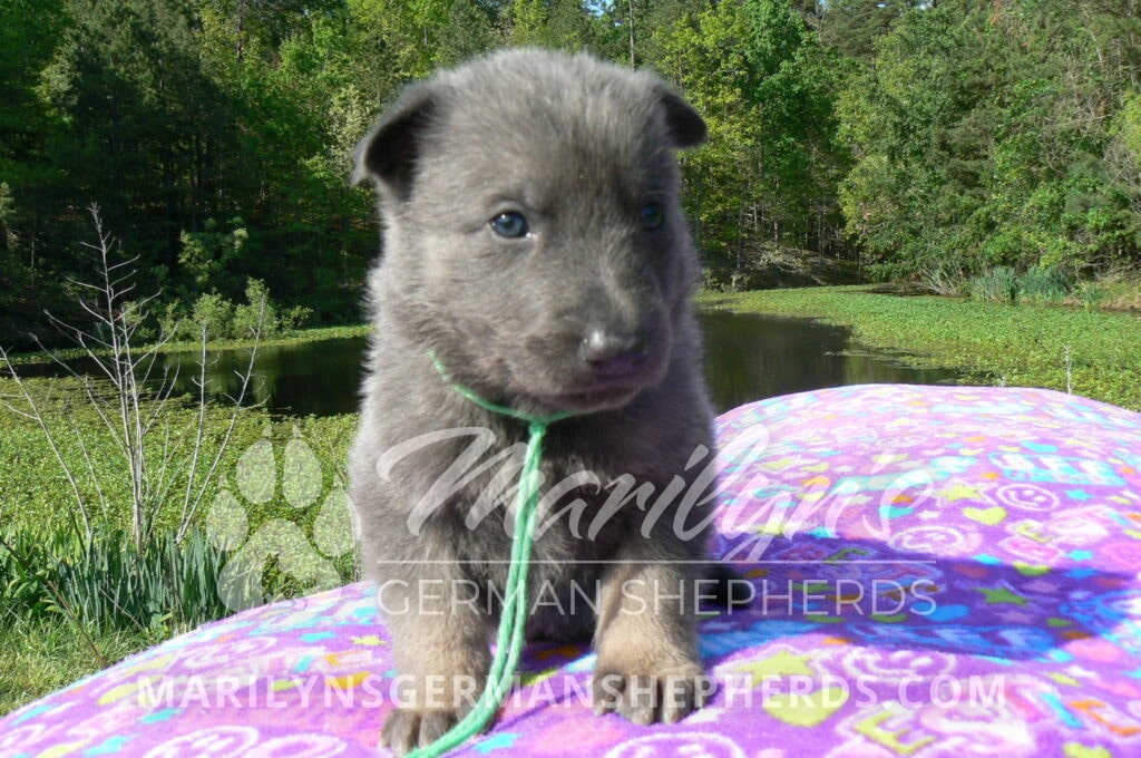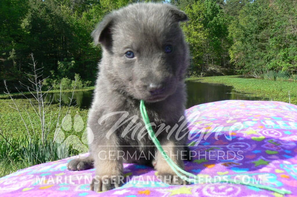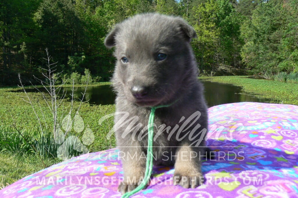 Foxy’s Mr. Key Lime Cake Pop is a blue and silver male puppy born 3-25-26, priced at $2150.00 with limited registration and a neuter contract. He has the option of PayPal Later payment plan through my website. His registration is AKC, American Kennel Club. He has a calm personality. He is a sweet boy that likes to cuddle. He has blue eyes. As an adult his eyes will stay blue or turn green or a gold hazel color. He is a very friendly puppy. He enjoys attention. He likes to play with his brothers and sisters. He has a soft short blue and silver coat. The color blue on a German Shepherd is a soft gray color. He is a short coat puppy. He is very alert and smart. He likes to be with people. He is a wonderful German Shepherd puppy. His mother is Foxy, my blue and tan mom. His father is Vanillabean Noel, my Isabella dad. The color Isabella is liver and blue together. He has a puppy replacement health guarantee on genetic issues until one year old. His shots and wormings are up to date and he has been vet checked. He comes with 30 days of pet insurance free for accidents and illnesses, that the new pet owner must activate. After the free 30 days you can keep the pet insurance or it will self cancel. He can be reserved for you with a $200.00 non-refundable deposit. I accept puppy payment through Paypal, cash, credit card, or Venmo. He is available for puppy pick up May 20th. He can be shipped. Shipping is an additional cost of $680.00 which includes crate, airfare, and health certificate. I fly my puppies on Fridays. He will make an amazing new addition to your family.