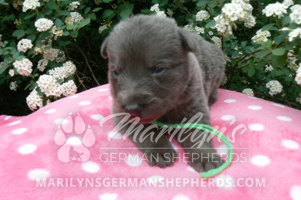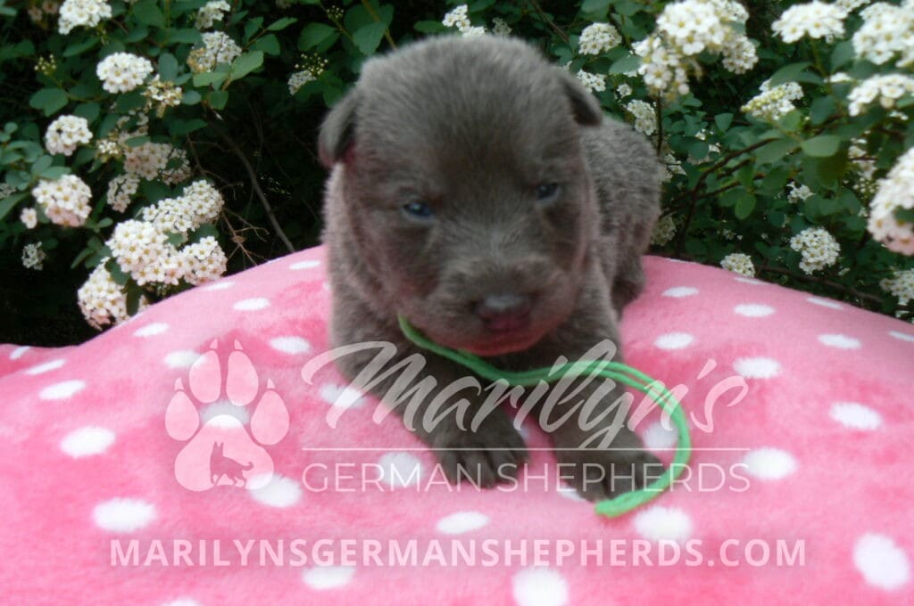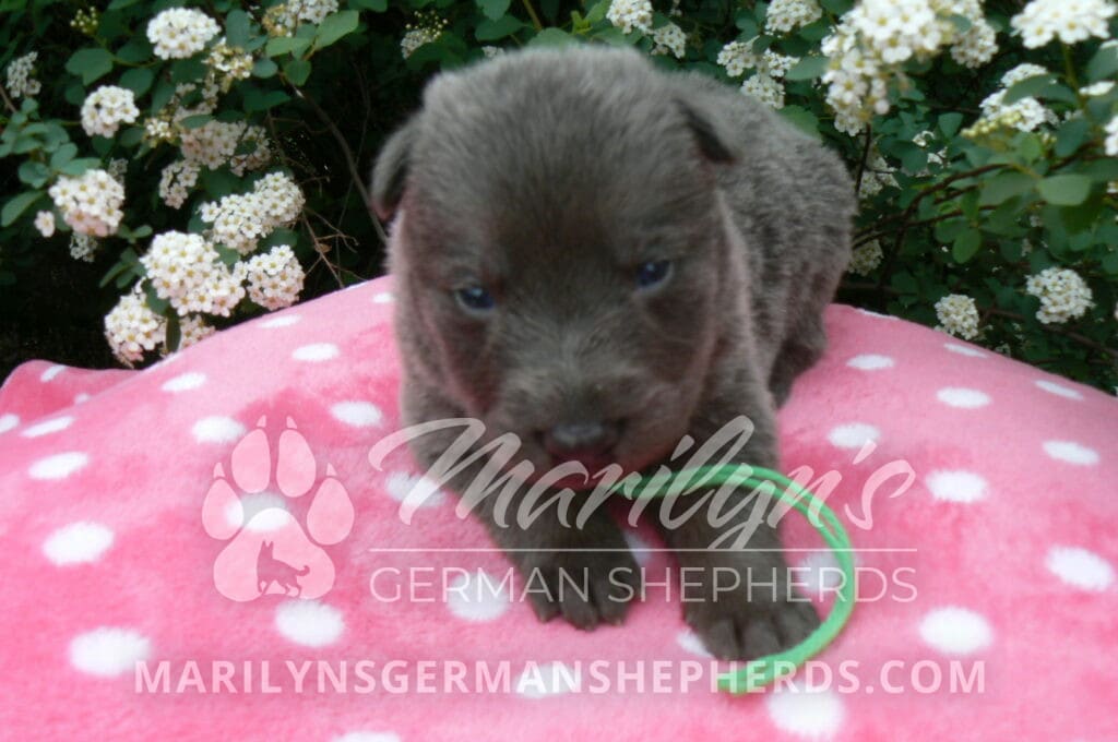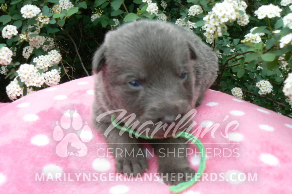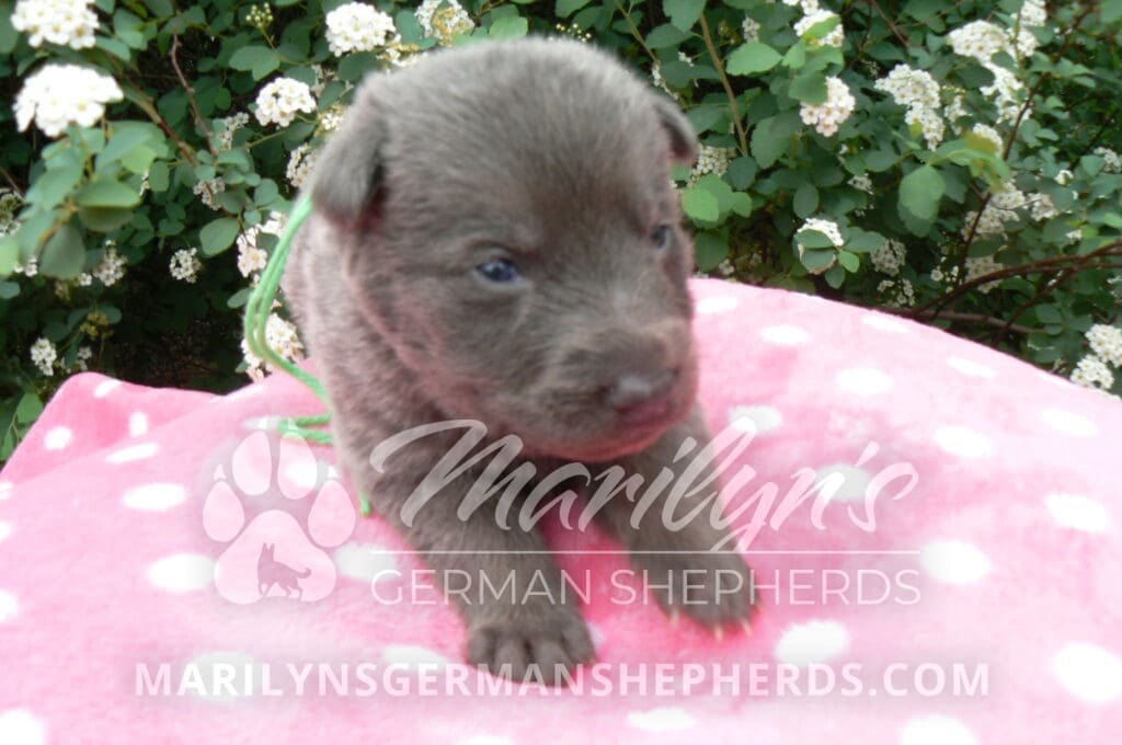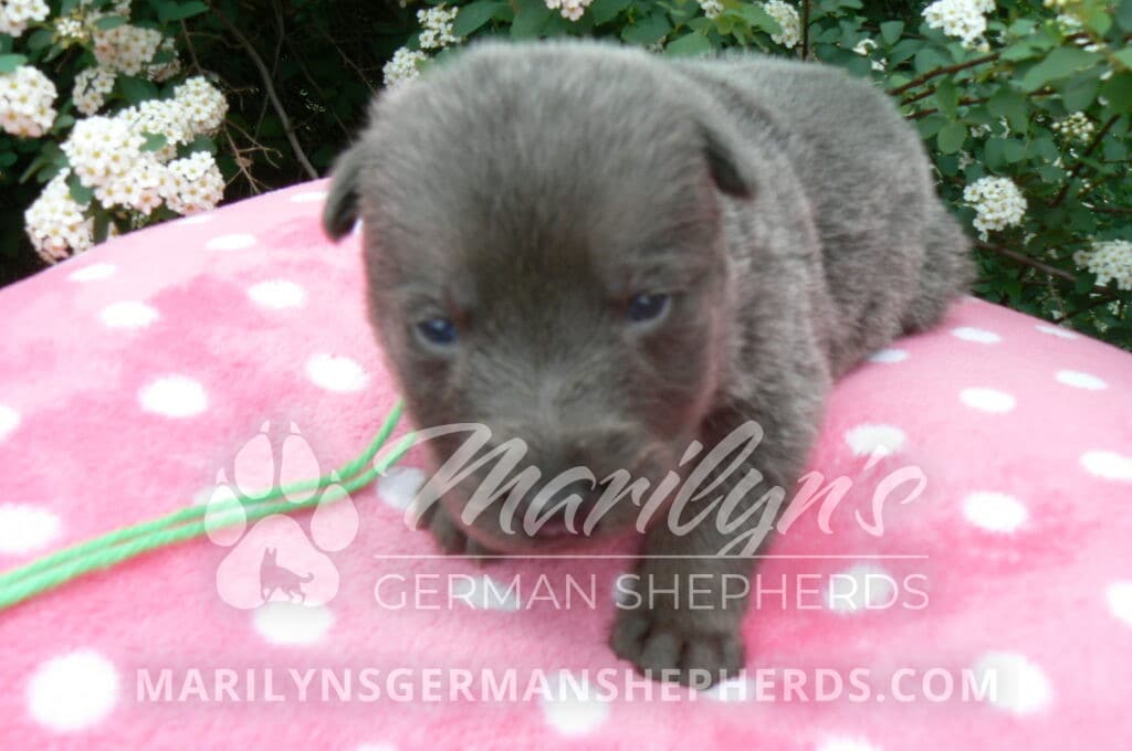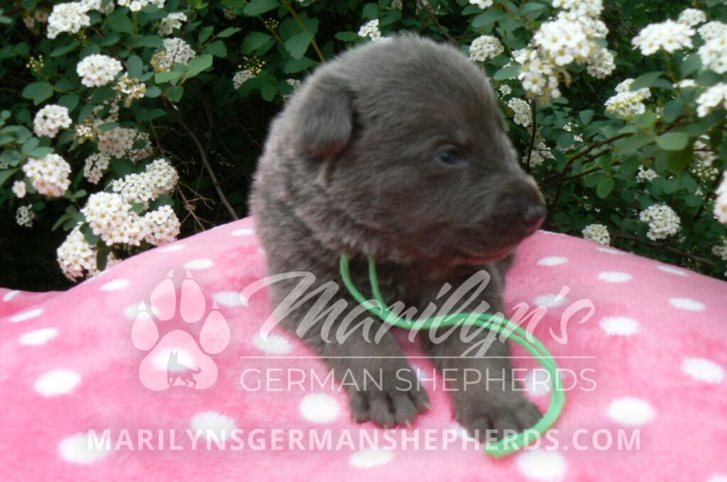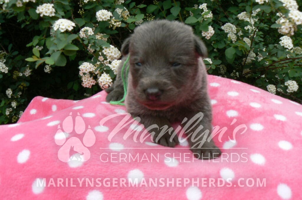 Foxy’s Mr. Key Lime Cake Pop is a blue and silver male puppy born 3-25-26, priced at $2150.00 with limited registration and a neuter contract. He has the option of PayPal Later payment plan through my website. His registration is AKC, American Kennel Club. He has a calm personality. He is a sweet boy that likes to cuddle. He has blue eyes. As an adult his eyes will stay blue or turn green or a gold hazel color. He is a very friendly puppy. He enjoys attention. He likes to play with his brothers and sisters. He has a soft short blue and silver coat. The color blue on a German Shepherd is a soft gray color. He is a short coat puppy. He is very alert and smart. He likes to be with people. He is a wonderful German Shepherd puppy. His mother is Foxy, my blue and tan mom. His father is Vanillabean Noel, my Isabella dad. The color Isabella is liver and blue together. He has a puppy replacement health guarantee on genetic issues until one year old. His shots and wormings are up to date and he has been vet checked. He comes with 30 days of pet insurance free for accidents and illnesses, that the new pet owner must activate. After the free 30 days you can keep the pet insurance or it will self cancel. He can be reserved for you with a $200.00 non-refundable deposit. I accept puppy payment through Paypal, cash, credit card, or Venmo. He is available for puppy pick up May 20th. He can be shipped. Shipping is an additional cost of $680.00 which includes crate, airfare, and health certificate. I fly my puppies on Fridays. He will make an amazing new addition to your family.