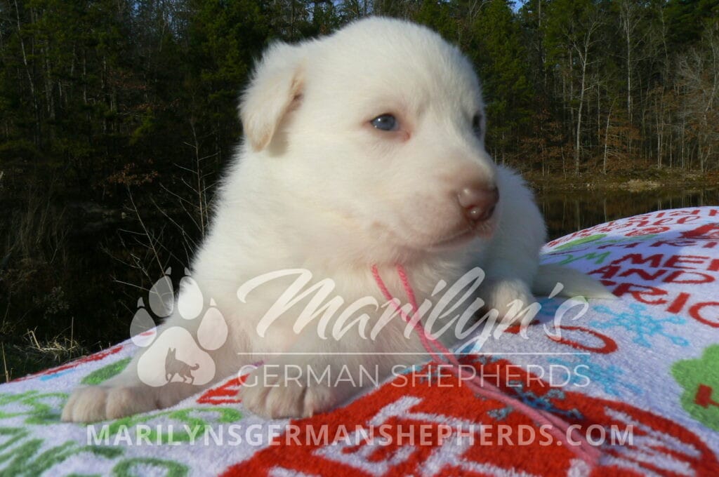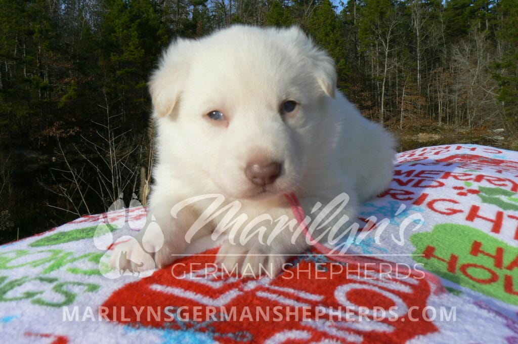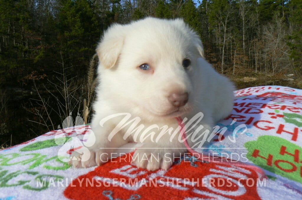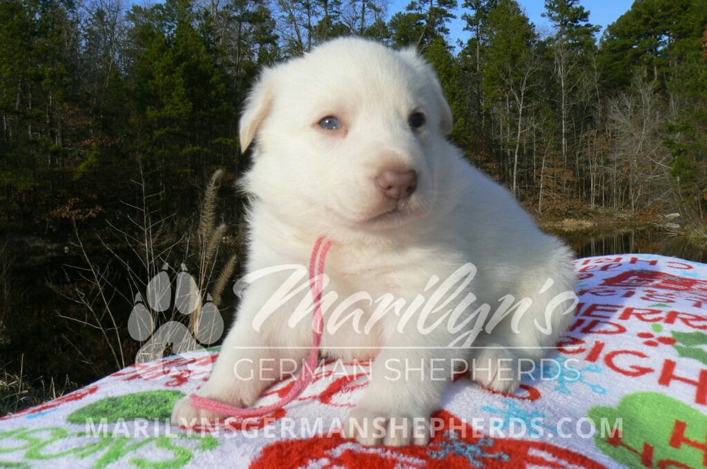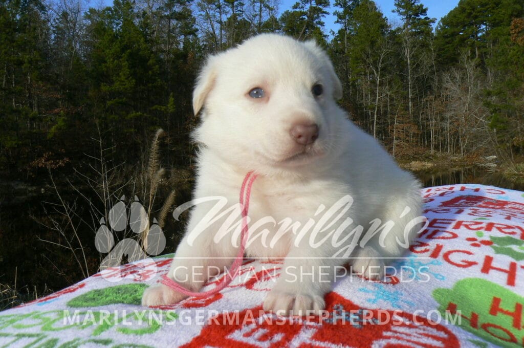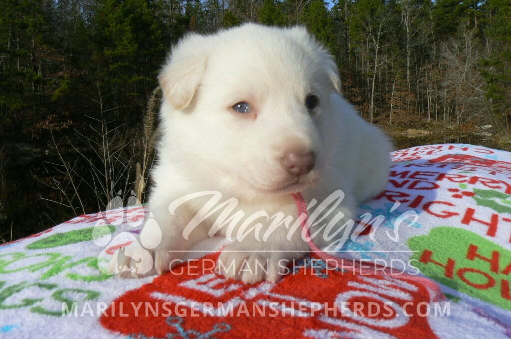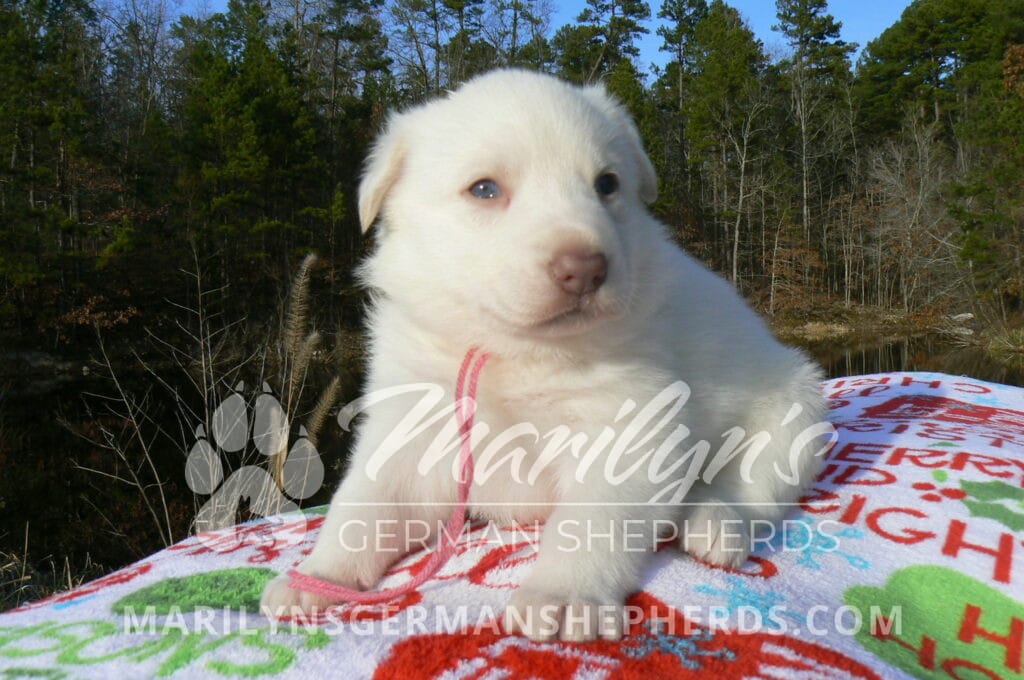 Goldie’s Miss Gingham Gorgeous is a beautiful rare white female puppy with blue eyes born 11-24-25, priced at $2150.00 with limited registration and a spay contract. PayPal Later is available for a puppy payment option. Her registration is AKC, American Kennel Club. She has a loving personality. She has beautiful blue eyes. Her eyes will stay blue, or turn green, or be a light hazel color when she is an adult. She is actually a blue German Shepherd puppy in a white coat that is why she has blue eyes. She is a short coat puppy. She looks like a cute little polar bear cub romping around playing with her family. She is adorable! She is very smart. She is a very friendly, loving puppy. She likes attention and likes to be picked up and loved on. She likes to be around people. She will make you smile everyday. Her mother is Goldie, my blue fawn mom. Her father is Vanillabean Noel, my Isabella dad. The color Isabella is liver and blue together. She has a puppy replacement health guarantee on genetic issues until one year old. Her shots and wormings are up to date and she has been vet checked. She comes with 30 days of free pet insurance on accidents and illnesses, that the new pet owner must activate. After the free 30 days you can keep the pet insurance or it will self cancel. She can be reserved for you with a $200.00 non-refundable deposit. I accept puppy payment through Paypal, cash, credit card, PayPal Later or Venmo. She is available for puppy pick up January 19th. She can be shipped. Shipping is $680.00 which includes crate, airfare and health certificate. I fly my puppies on Fridays. She will make an amazing new addition to your family.