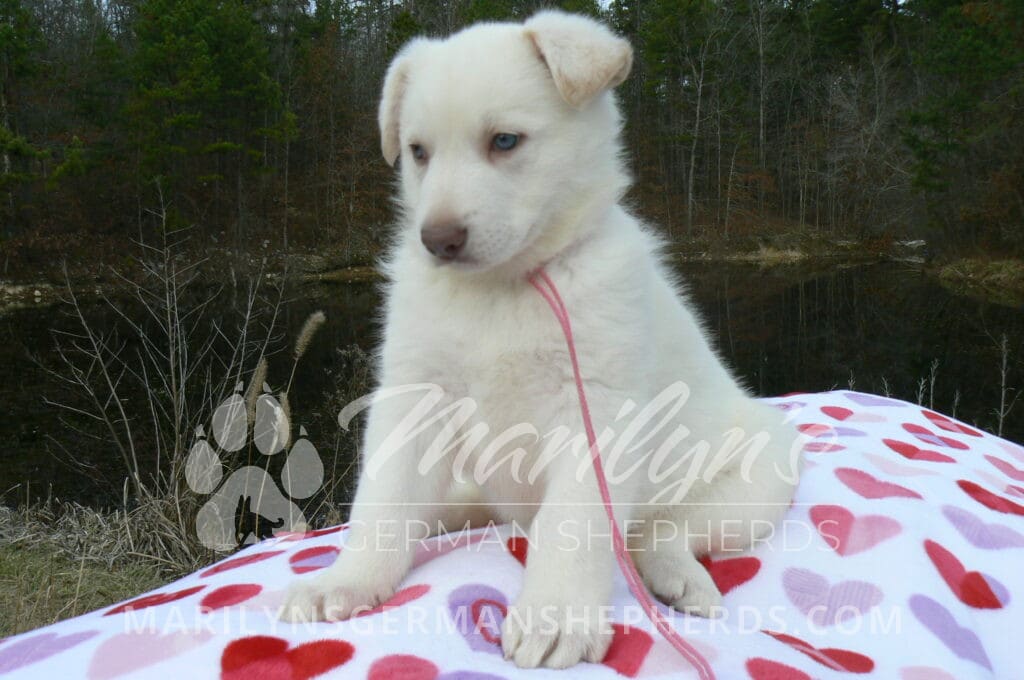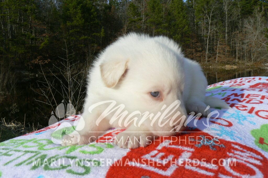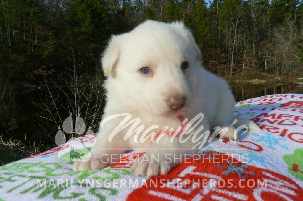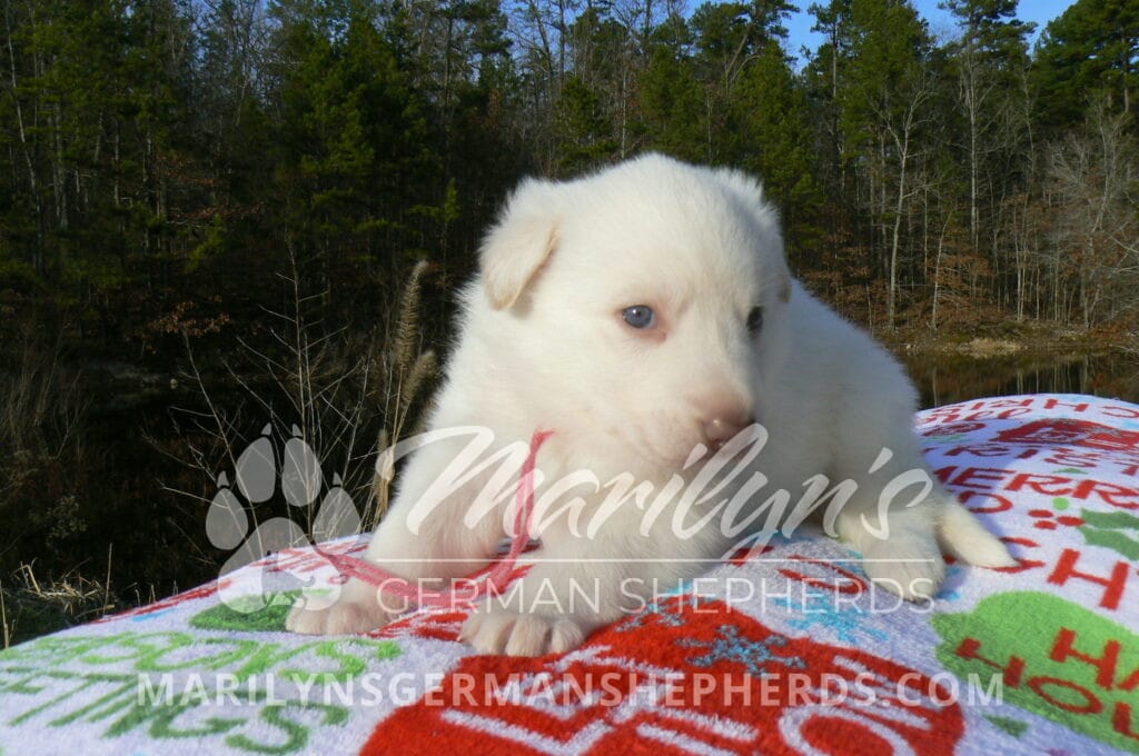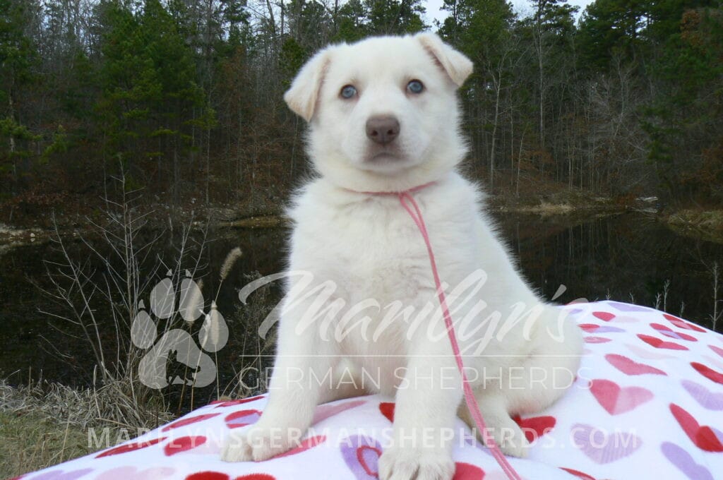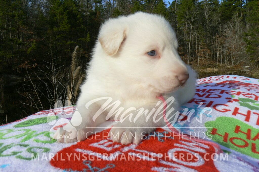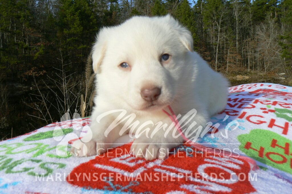 Goldie’s Miss Gingham Gorgeous is a beautiful rare white female puppy with blue eyes born 11-24-25, priced at $2150.00 with limited registration and a spay contract. PayPal Later is available for a puppy payment option. Her registration is AKC, American Kennel Club. She has a loving personality. She has beautiful blue eyes. Her eyes will stay blue, or turn green, or be a light hazel color when she is an adult. She is actually a blue German Shepherd puppy in a white coat that is why she has blue eyes. She is a short coat puppy. She looks like a cute little polar bear cub romping around playing with her family. She is adorable! She is very smart. She is a very friendly, loving puppy. She likes attention and likes to be picked up and loved on. She likes to be around people. She will make you smile everyday. Her mother is Goldie, my blue fawn mom. Her father is Vanillabean Noel, my Isabella dad. The color Isabella is liver and blue together. She has a puppy replacement health guarantee on genetic issues until one year old. Her shots and wormings are up to date and she has been vet checked. She comes with 30 days of free pet insurance on accidents and illnesses, that the new pet owner must activate. After the free 30 days you can keep the pet insurance or it will self cancel. She can be reserved for you with a $200.00 non-refundable deposit. I accept puppy payment through Paypal, cash, credit card, PayPal Later or Venmo. She is available for puppy pick up January 19th. She can be shipped. Shipping is $680.00 which includes crate, airfare and health certificate. I fly my puppies on Fridays. She will make an amazing new addition to your family.