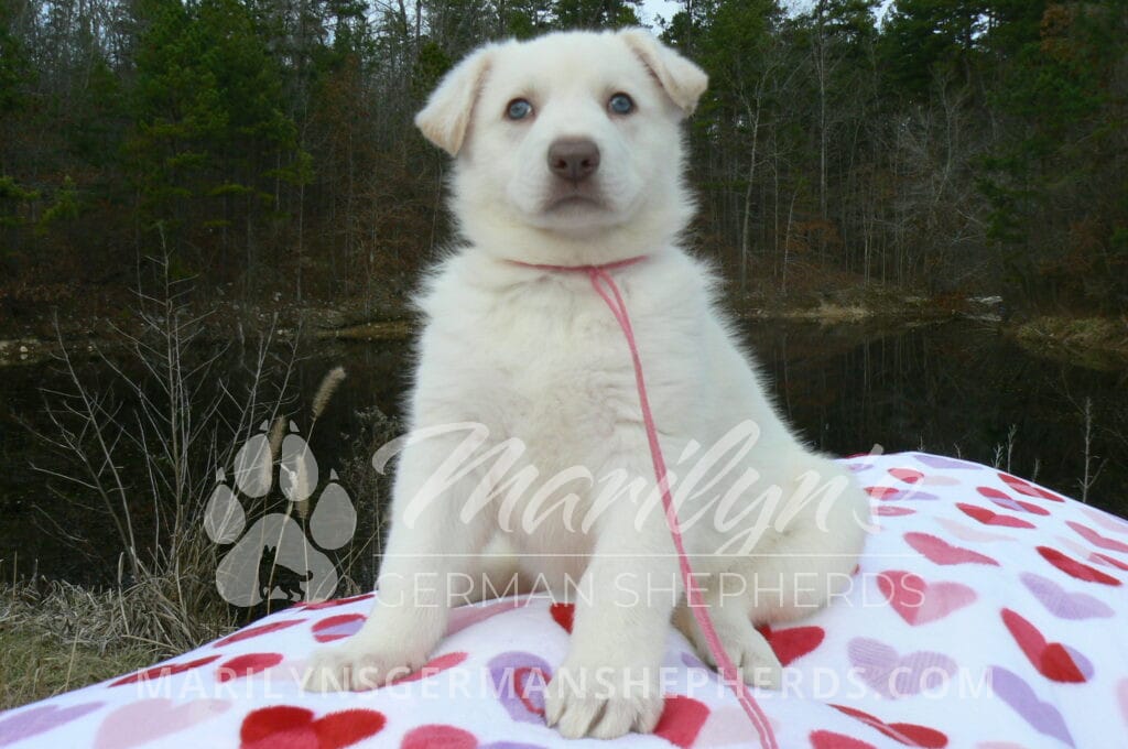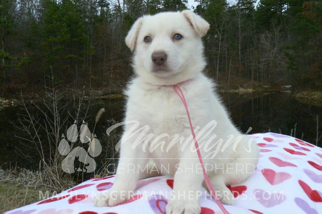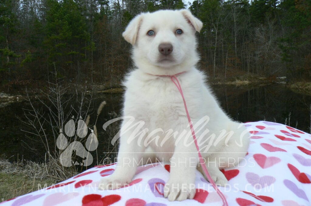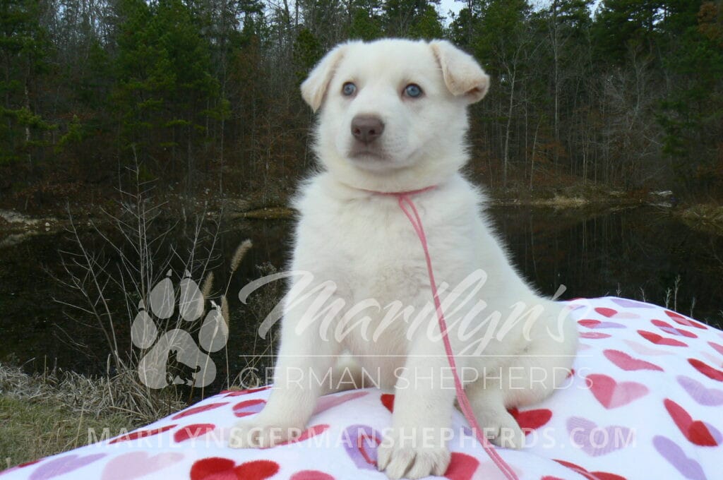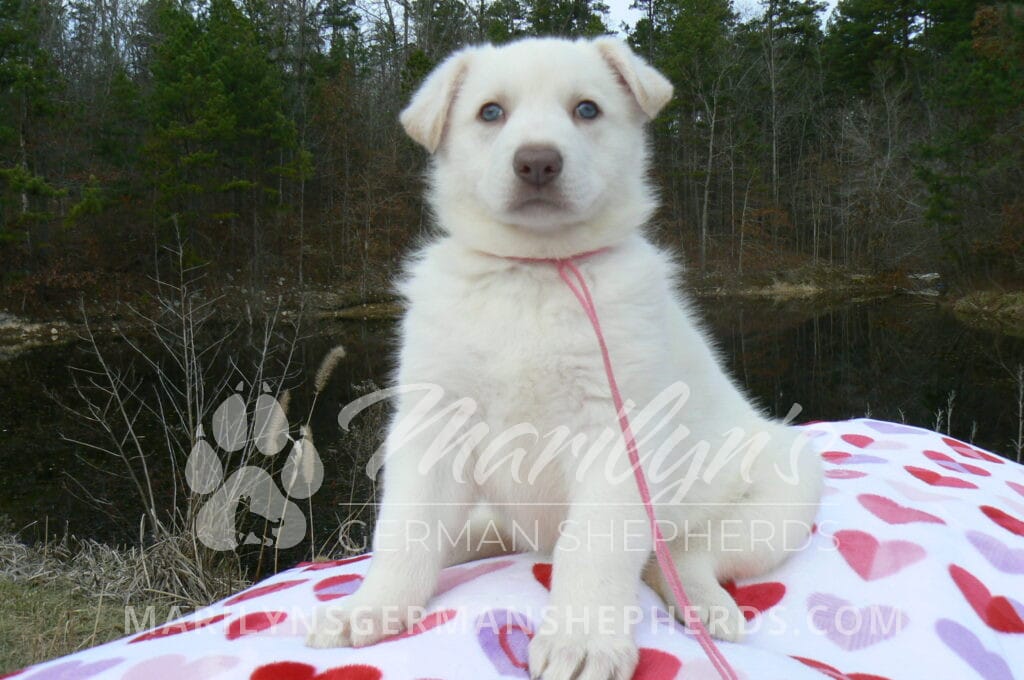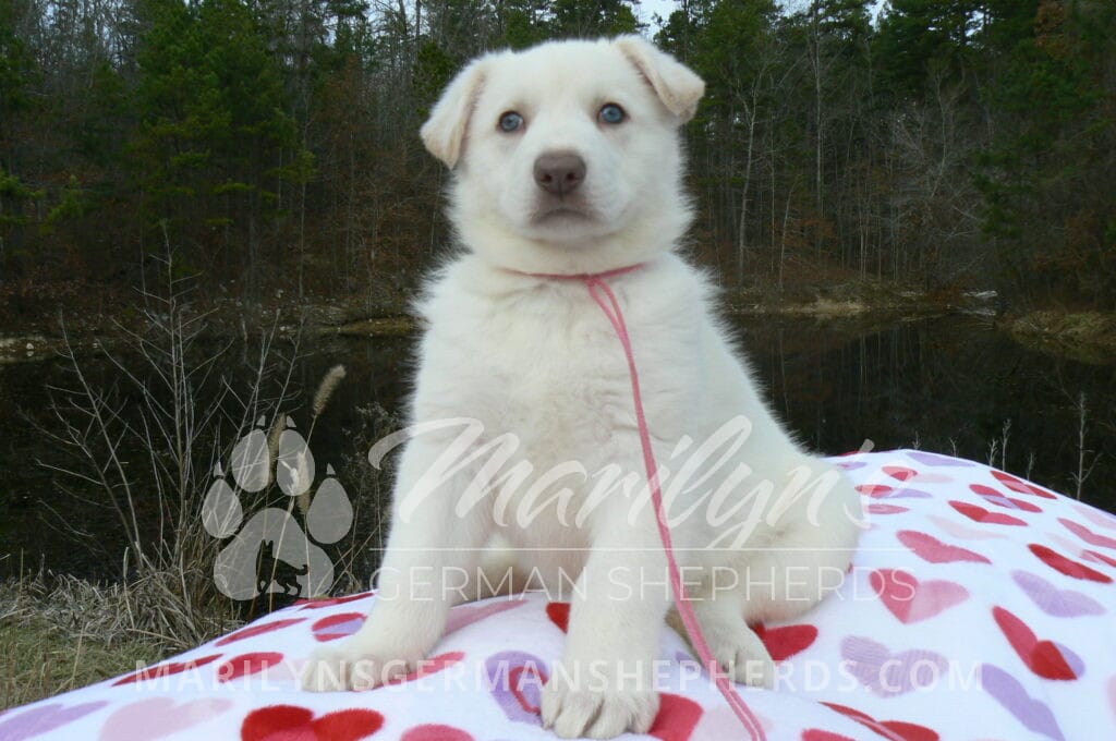 Goldie’s Miss Gingham Gorgeous is a beautiful rare white female puppy with blue eyes born 11-24-25, priced at $2150.00 with limited registration and a spay contract. PayPal Later is available for a puppy payment option. Her registration is AKC, American Kennel Club. She has a loving personality. She has beautiful blue eyes. Her eyes will stay blue, or turn green, or be a light hazel color when she is an adult. She is actually a blue German Shepherd puppy in a white coat that is why she has blue eyes. She is a short coat puppy. She looks like a cute little polar bear cub romping around playing with her family. She is adorable! She is very smart. She is a very friendly, loving puppy. She likes attention and likes to be picked up and loved on. She likes to be around people. She will make you smile everyday. Her mother is Goldie, my blue fawn mom. Her father is Vanillabean Noel, my Isabella dad. The color Isabella is liver and blue together. She has a puppy replacement health guarantee on genetic issues until one year old. Her shots and wormings are up to date and she has been vet checked. She comes with 30 days of free pet insurance on accidents and illnesses, that the new pet owner must activate. After the free 30 days you can keep the pet insurance or it will self cancel. She can be reserved for you with a $200.00 non-refundable deposit. I accept puppy payment through Paypal, cash, credit card, PayPal Later or Venmo. She is available for puppy pick up January 19th. She can be shipped. Shipping is $680.00 which includes crate, airfare and health certificate. I fly my puppies on Fridays. She will make an amazing new addition to your family.