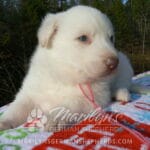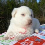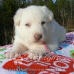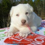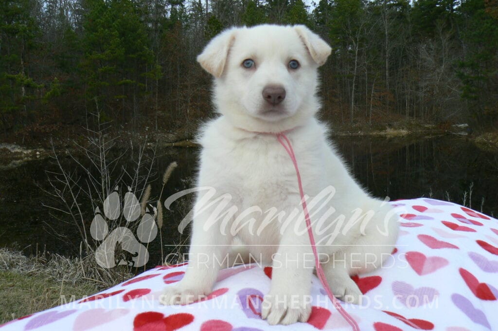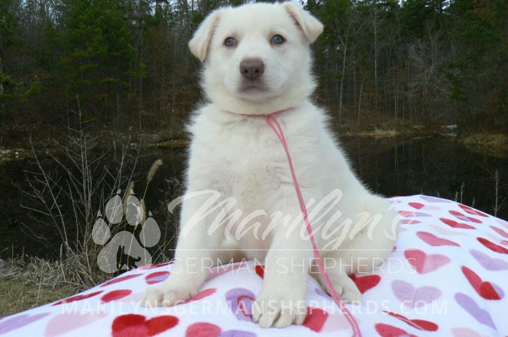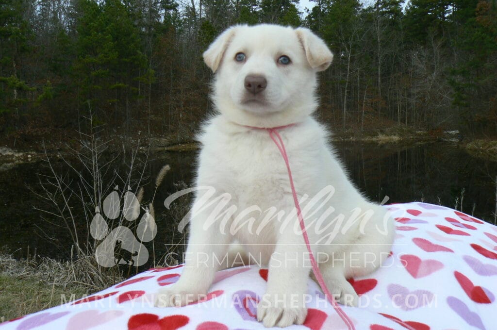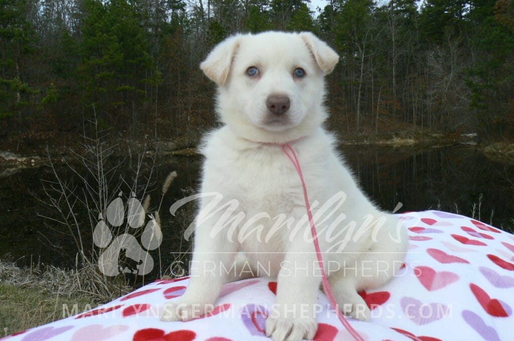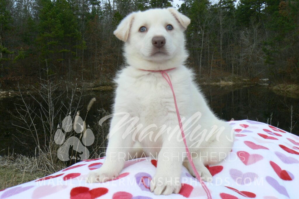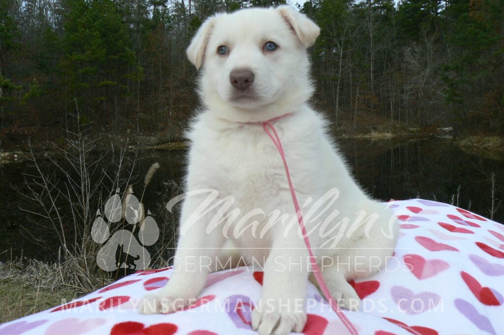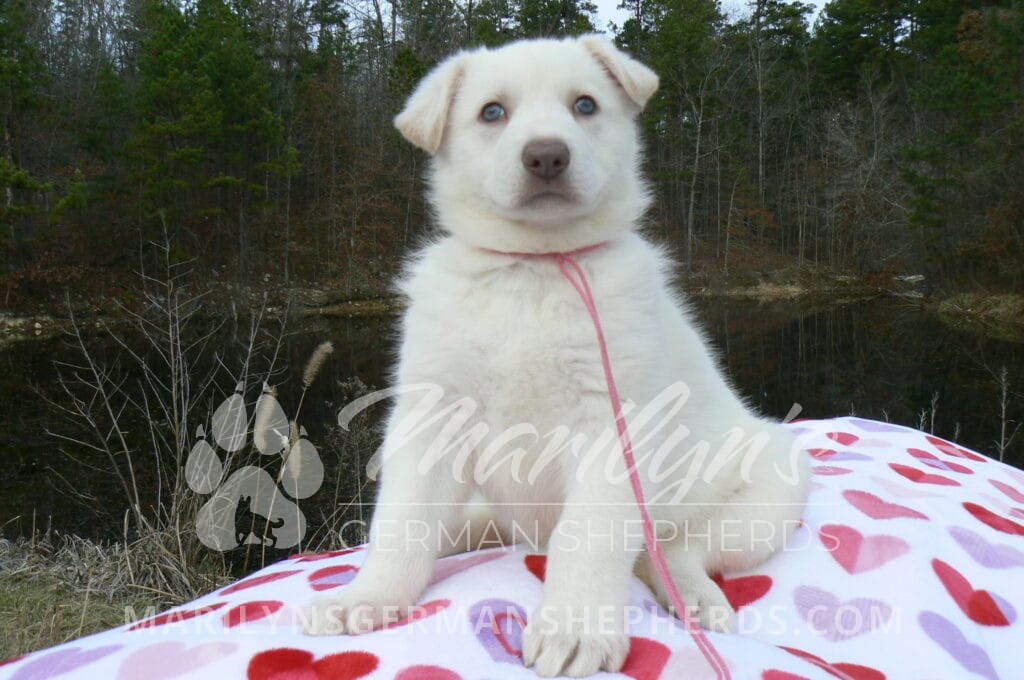 Goldie’s Miss Gingham Gorgeous is a beautiful rare white female puppy with blue eyes born 11-24-25, priced at $2150.00 with limited registration and a spay contract. PayPal Later is available for a puppy payment option. Her registration is AKC, American Kennel Club. She has a loving personality. She has beautiful blue eyes. Her eyes will stay blue, or turn green, or be a light hazel color when she is an adult. She is actually a blue German Shepherd puppy in a white coat that is why she has blue eyes. She is a short coat puppy. She looks like a cute little polar bear cub romping around playing with her family. She is adorable! She is very smart. She is a very friendly, loving puppy. She likes attention and likes to be picked up and loved on. She likes to be around people. She will make you smile everyday. Her mother is Goldie, my blue fawn mom. Her father is Vanillabean Noel, my Isabella dad. The color Isabella is liver and blue together. She has a puppy replacement health guarantee on genetic issues until one year old. Her shots and wormings are up to date and she has been vet checked. She comes with 30 days of free pet insurance on accidents and illnesses, that the new pet owner must activate. After the free 30 days you can keep the pet insurance or it will self cancel. She can be reserved for you with a $200.00 non-refundable deposit. I accept puppy payment through Paypal, cash, credit card, PayPal Later or Venmo. She is available for puppy pick up January 19th. She can be shipped. Shipping is $680.00 which includes crate, airfare and health certificate. I fly my puppies on Fridays. She will make an amazing new addition to your family.