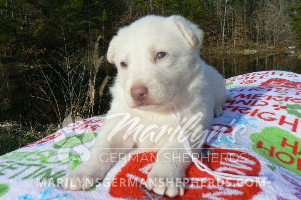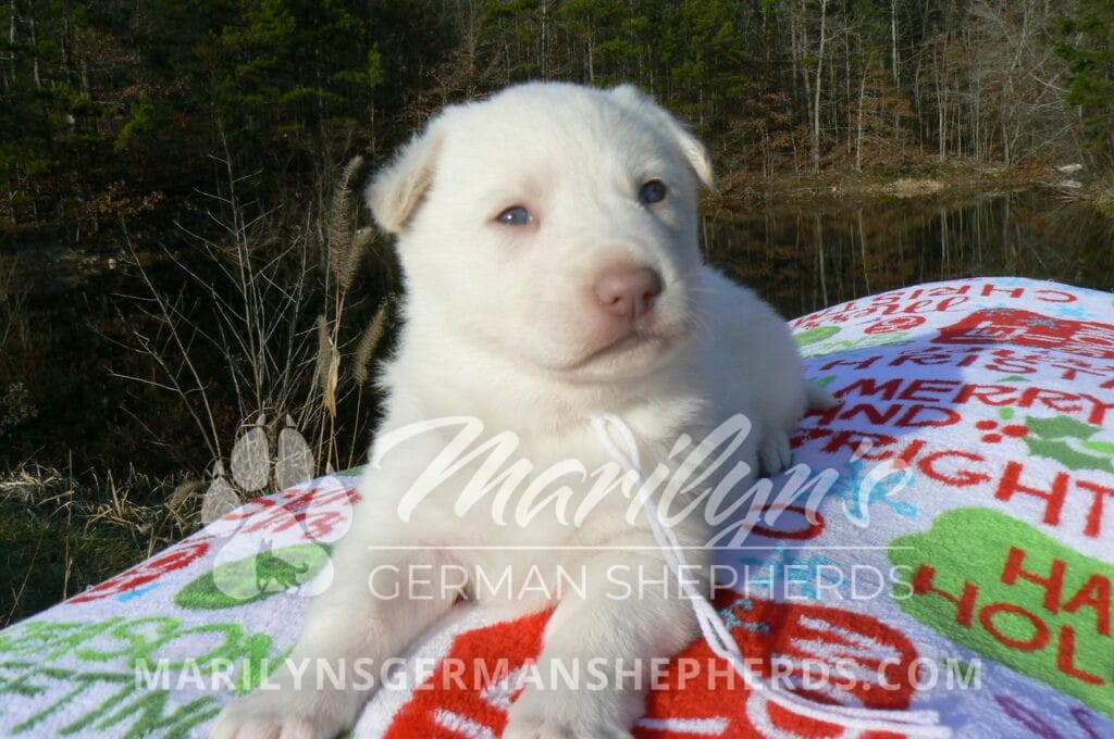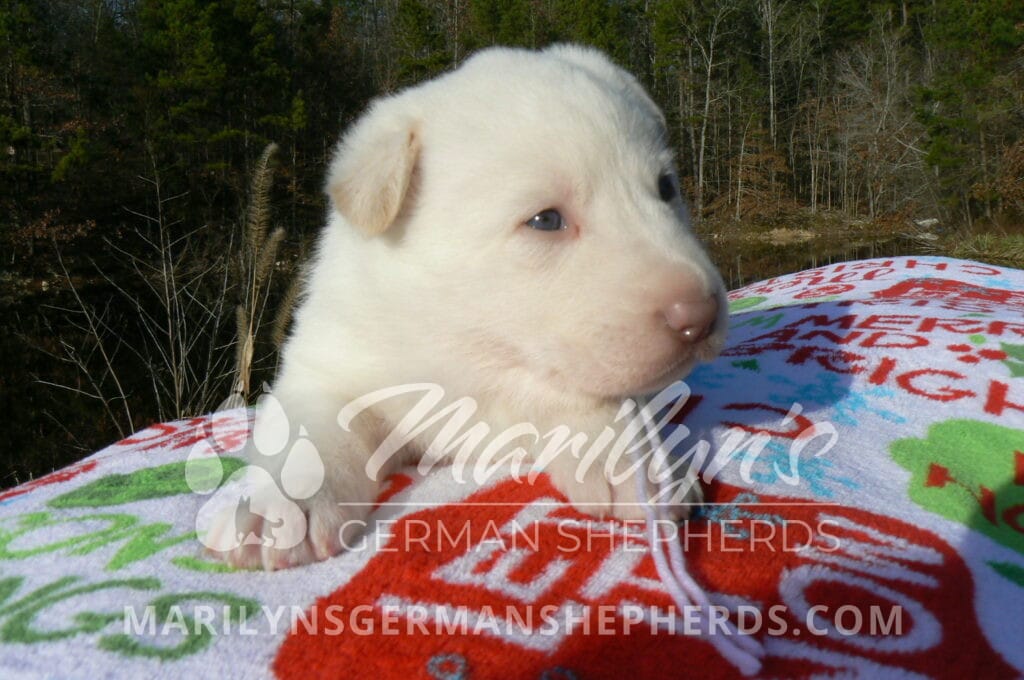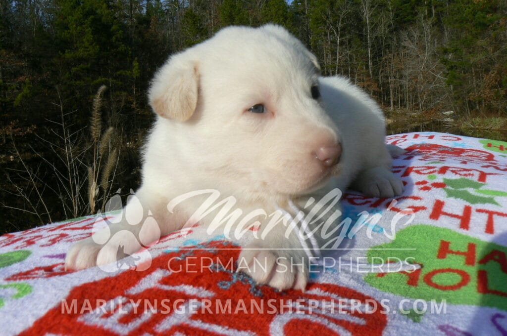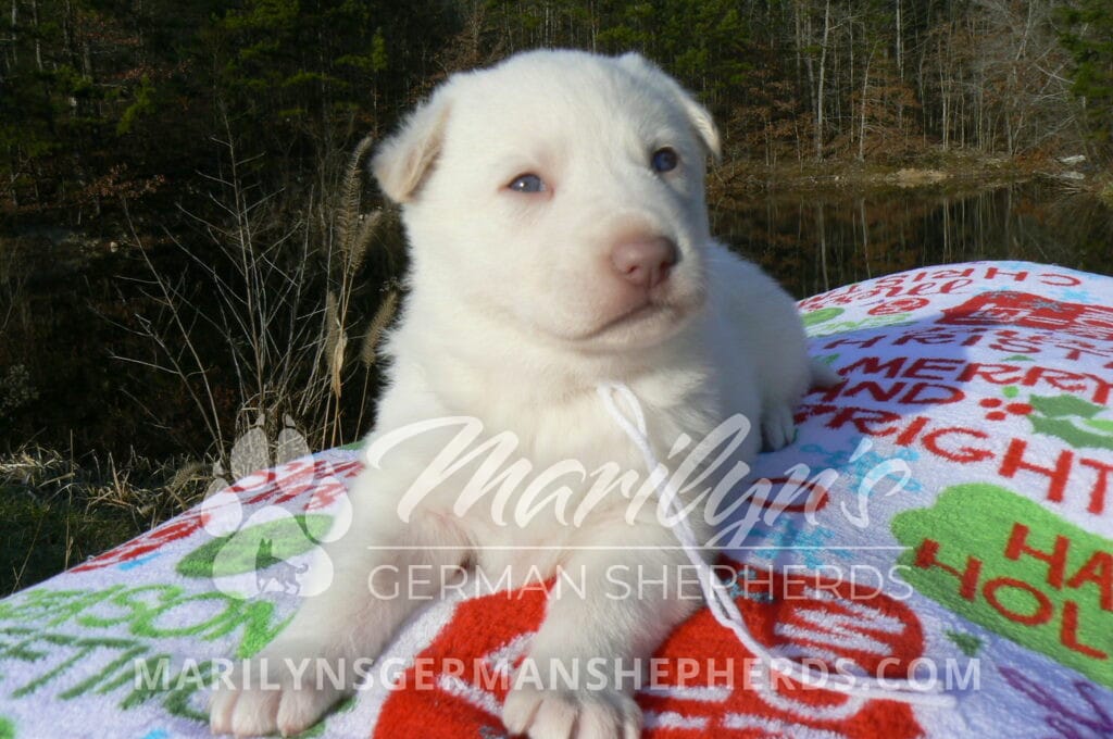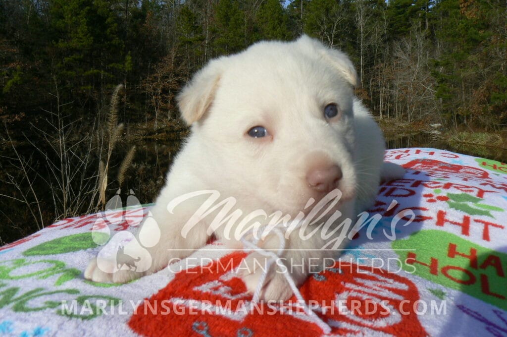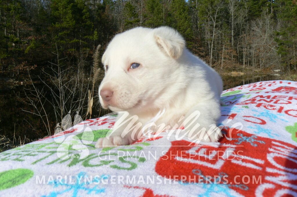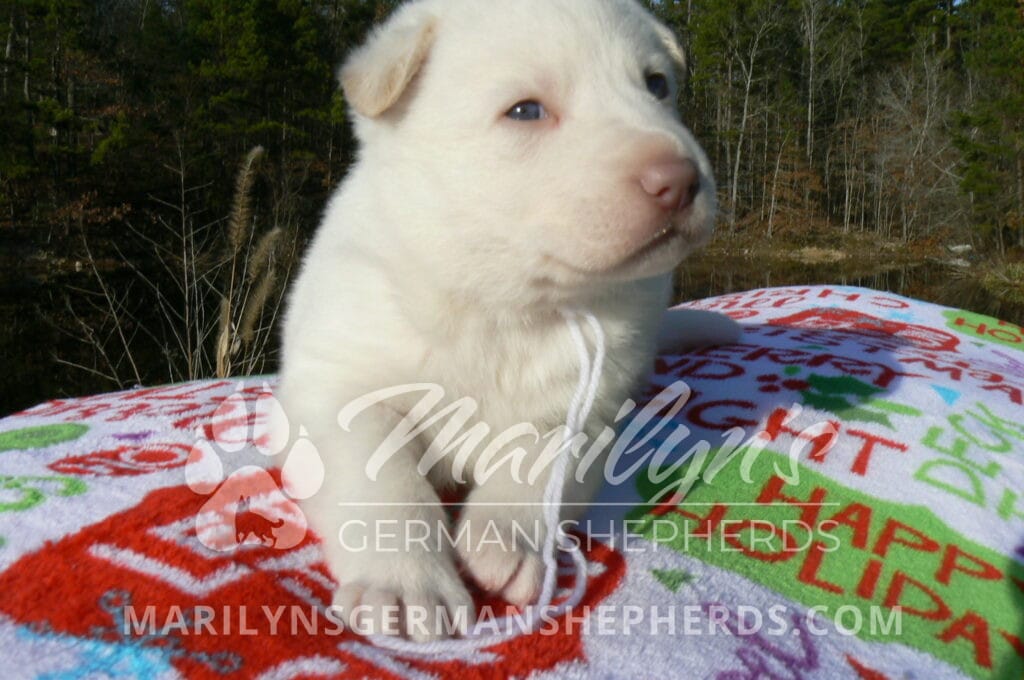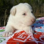 Goldie’s Miss Snowflakes and Cashmere is a beautiful rare snow white female puppy with blue eyes born 11-24-25, priced at $2150.00 with limited registration and a spay contract. PayPal Later is available for a puppy payment option. Her registration is AKC, American Kennel Club. She has a sweet calm personality. She has beautiful blue eyes. Her eyes will stay blue, or turn green, or be a light hazel color when she is an adult. She is actually a blue German Shepherd puppy in a white coat that is why she has blue eyes. She is a short coat puppy. She looks like a cute little polar bear cub romping around playing with her brothers and sisters. She is just too cute! She is very smart. She is a very friendly, loving puppy. She likes attention and likes to be picked up and loved on. She likes to be around people. She is a sweetheart that will brighten up each day. Her mother is Goldie, my blue fawn mom. Her father is Vanillabean Noel, my Isabella dad. The color Isabella is liver and blue together. She has a puppy replacement health guarantee on genetic issues until one year old. Her shots and wormings are up to date and she has been vet checked. She comes with 30 days of free pet insurance on accidents and illnesses, that the new pet owner must activate. After the free 30 days you can keep the pet insurance or it will self cancel. She can be reserved for you with a $200.00 non-refundable deposit. I accept puppy payment through Paypal, cash, credit card, PayPal Later or Venmo. She is available for puppy pick up January 19th. She can be shipped. Shipping is $680.00 which includes crate, airfare and health certificate. I fly my puppies on Fridays. She will make an amazing new addition to your family.