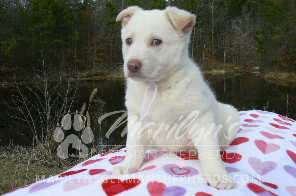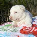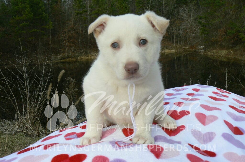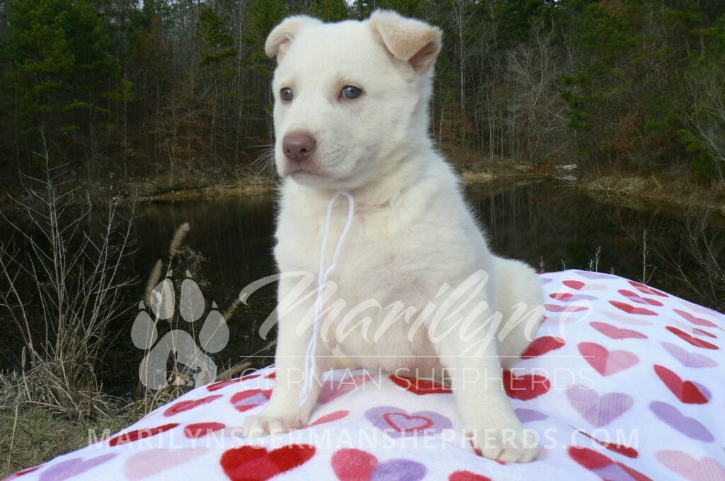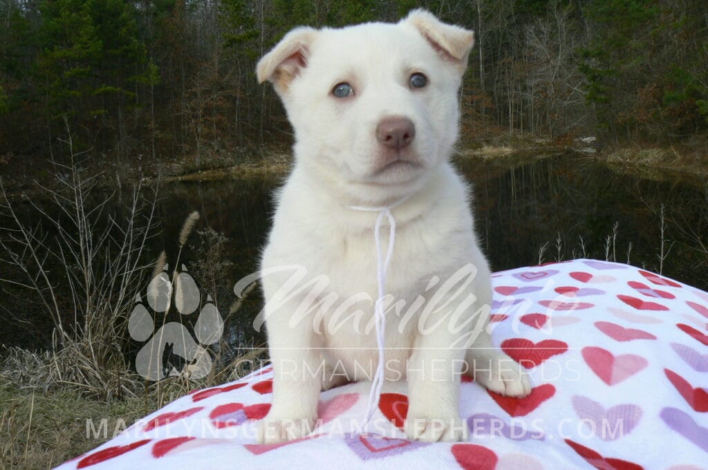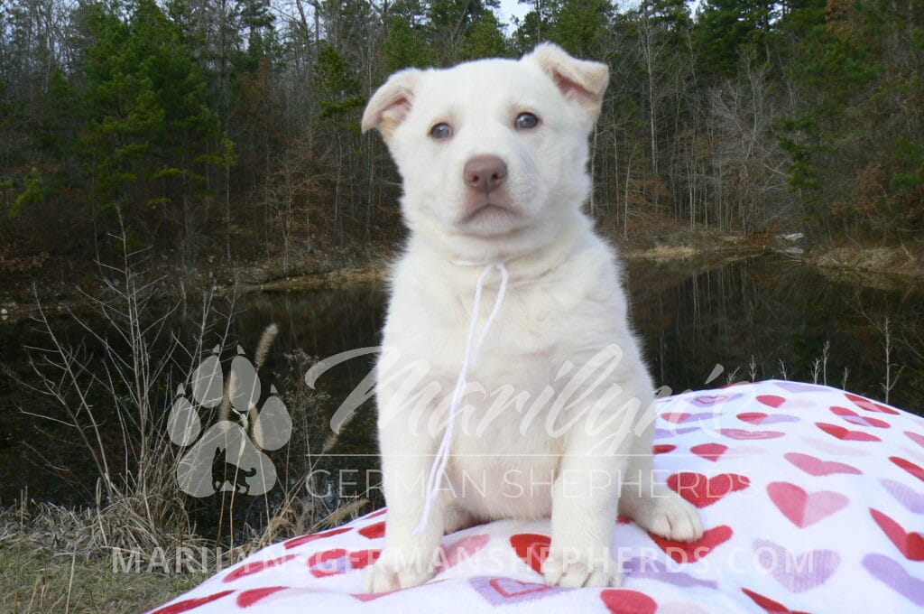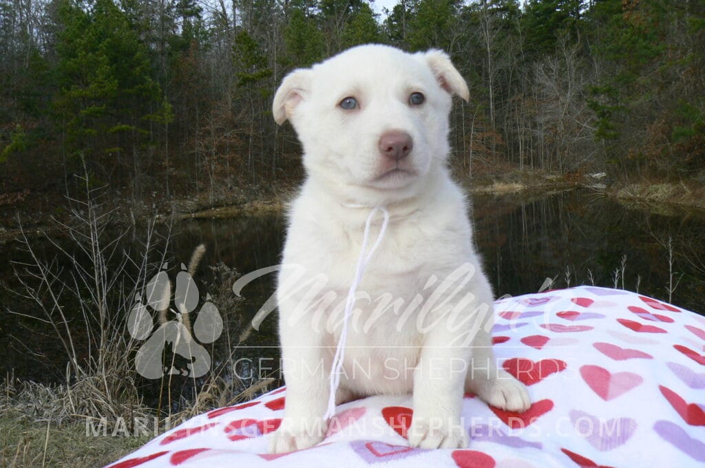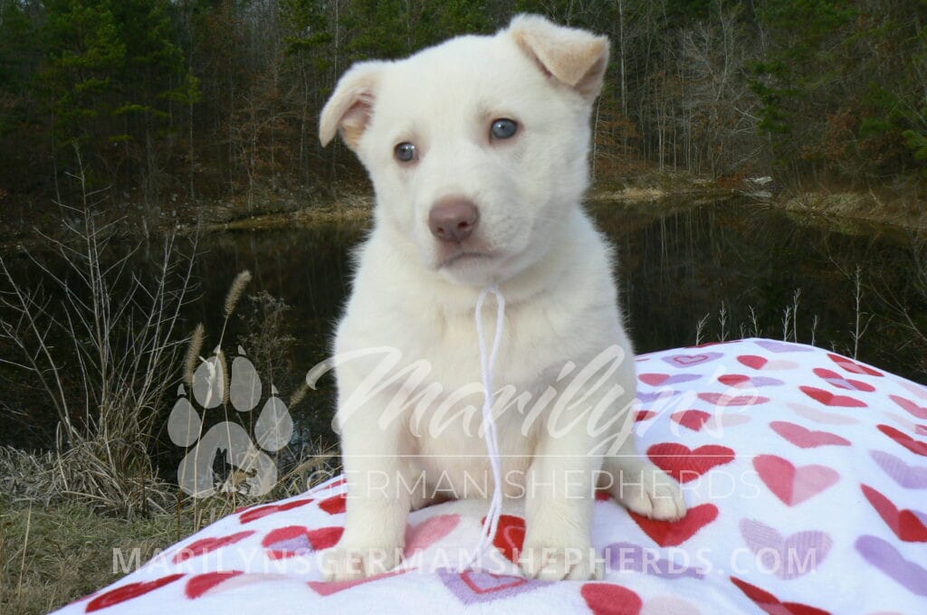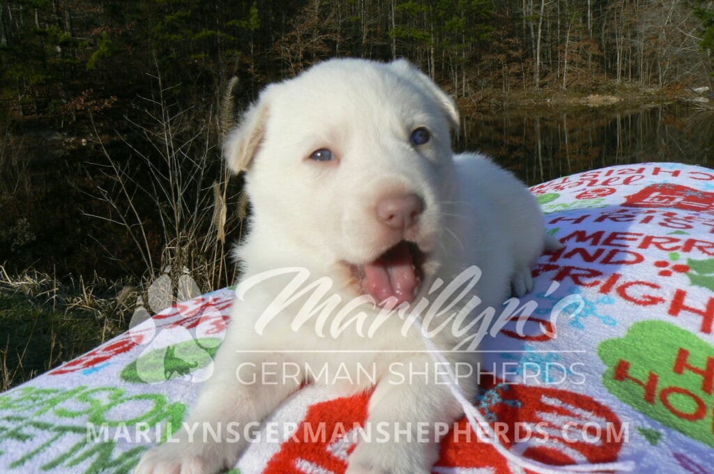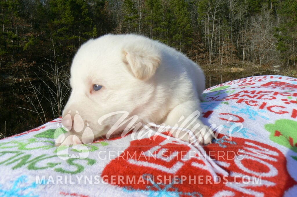 Goldie’s Miss Snowflakes and Cashmere is a beautiful rare snow white female puppy with blue eyes born 11-24-25, priced at $2150.00 with limited registration and a spay contract. PayPal Later is available for a puppy payment option. Her registration is AKC, American Kennel Club. She has a sweet calm personality. She has beautiful blue eyes. Her eyes will stay blue, or turn green, or be a light hazel color when she is an adult. She is actually a blue German Shepherd puppy in a white coat that is why she has blue eyes. She is a short coat puppy. She looks like a cute little polar bear cub romping around playing with her brothers and sisters. She is just too cute! She is very smart. She is a very friendly, loving puppy. She likes attention and likes to be picked up and loved on. She likes to be around people. She is a sweetheart that will brighten up each day. Her mother is Goldie, my blue fawn mom. Her father is Vanillabean Noel, my Isabella dad. The color Isabella is liver and blue together. She has a puppy replacement health guarantee on genetic issues until one year old. Her shots and wormings are up to date and she has been vet checked. She comes with 30 days of free pet insurance on accidents and illnesses, that the new pet owner must activate. After the free 30 days you can keep the pet insurance or it will self cancel. She can be reserved for you with a $200.00 non-refundable deposit. I accept puppy payment through Paypal, cash, credit card, PayPal Later or Venmo. She is available for puppy pick up January 19th. She can be shipped. Shipping is $680.00 which includes crate, airfare and health certificate. I fly my puppies on Fridays. She will make an amazing new addition to your family.