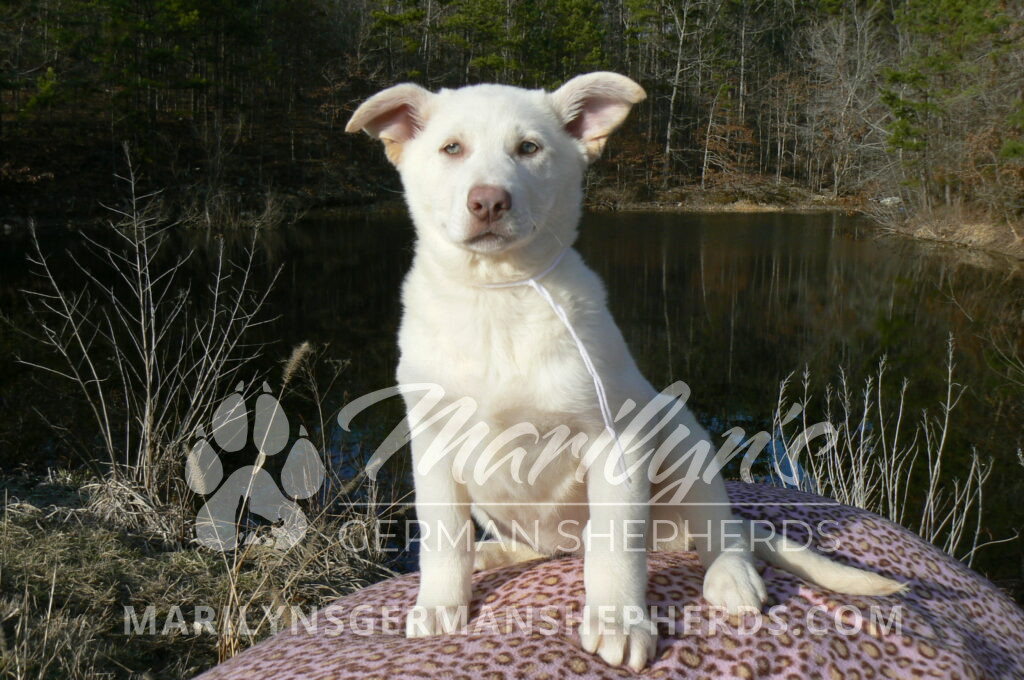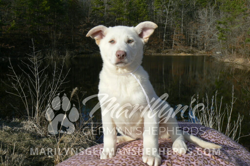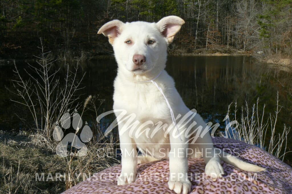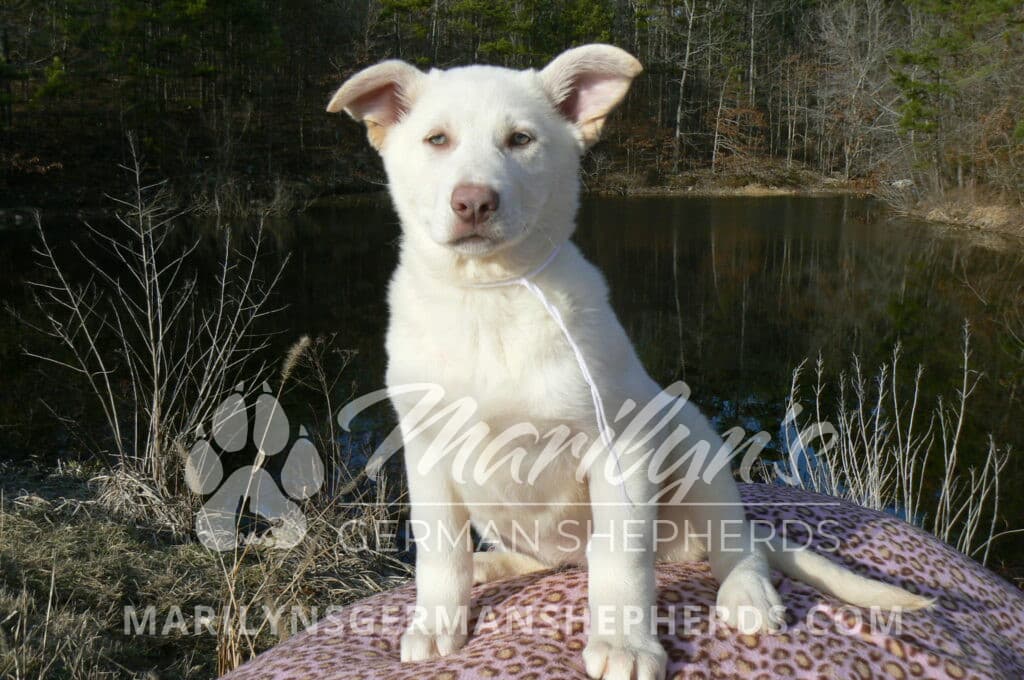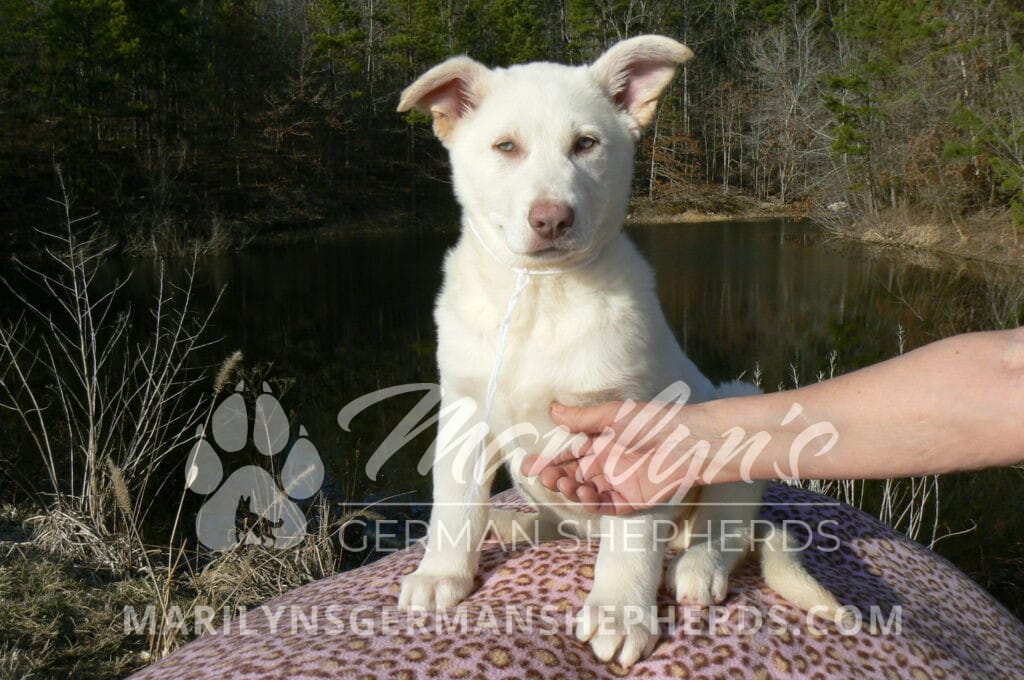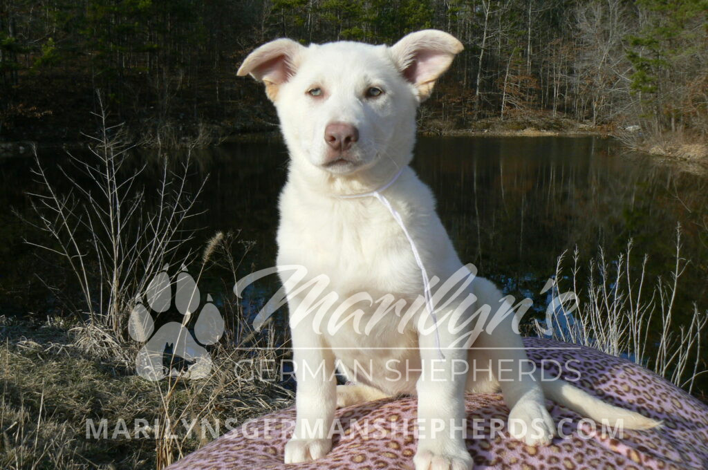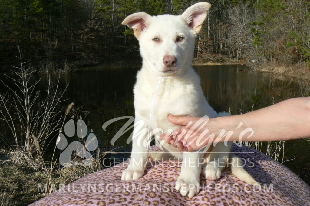 Goldie’s Miss Snowflakes and Cashmere is a beautiful rare snow white female puppy with blue eyes born 11-24-25, priced at $2150.00 with limited registration and a spay contract. PayPal Later is available for a puppy payment option. Her registration is AKC, American Kennel Club. She has a sweet calm personality. She has beautiful blue eyes. Her eyes will stay blue, or turn green, or be a light hazel color when she is an adult. She is actually a blue German Shepherd puppy in a white coat that is why she has blue eyes. She is a short coat puppy. She looks like a cute little polar bear cub romping around playing with her brothers and sisters. She is just too cute! She is very smart. She is a very friendly, loving puppy. She likes attention and likes to be picked up and loved on. She likes to be around people. She is a sweetheart that will brighten up each day. Her mother is Goldie, my blue fawn mom. Her father is Vanillabean Noel, my Isabella dad. The color Isabella is liver and blue together. She has a puppy replacement health guarantee on genetic issues until one year old. Her shots and wormings are up to date and she has been vet checked. She comes with 30 days of free pet insurance on accidents and illnesses, that the new pet owner must activate. After the free 30 days you can keep the pet insurance or it will self cancel. She can be reserved for you with a $200.00 non-refundable deposit. I accept puppy payment through Paypal, cash, credit card, PayPal Later or Venmo. She is available for puppy pick up now. She can be shipped. Shipping is $680.00 which includes crate, airfare and health certificate. I fly my puppies on Fridays. She will make an amazing new addition to your family.