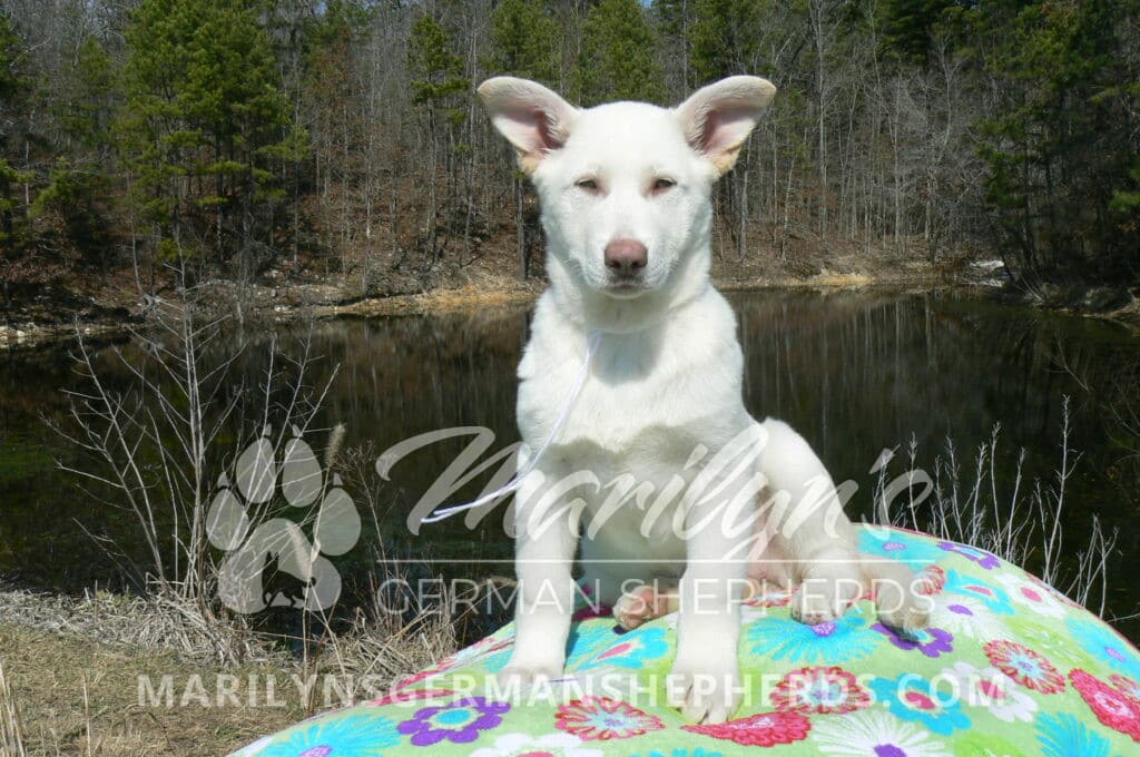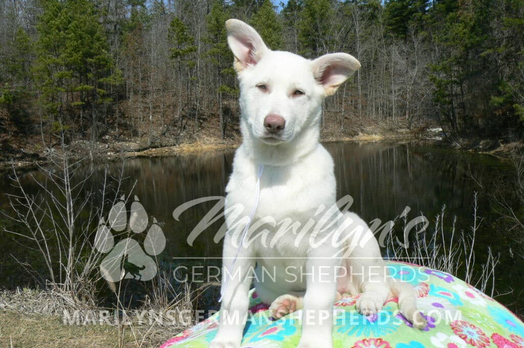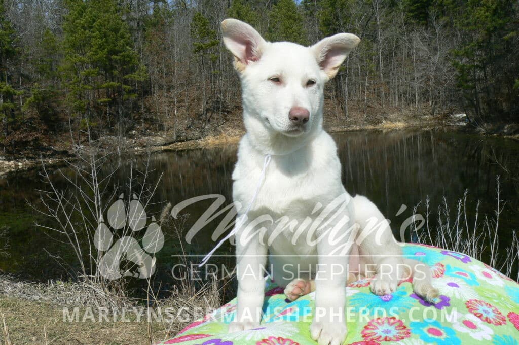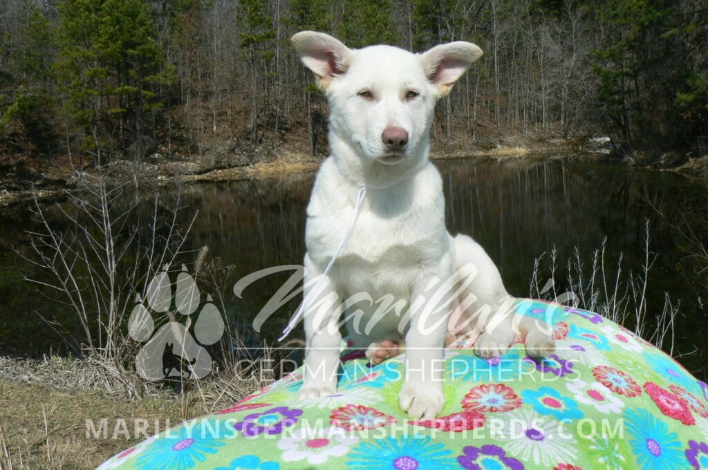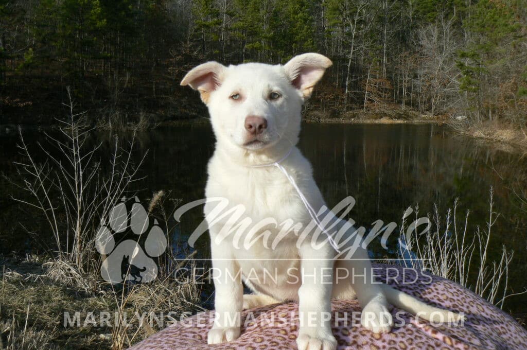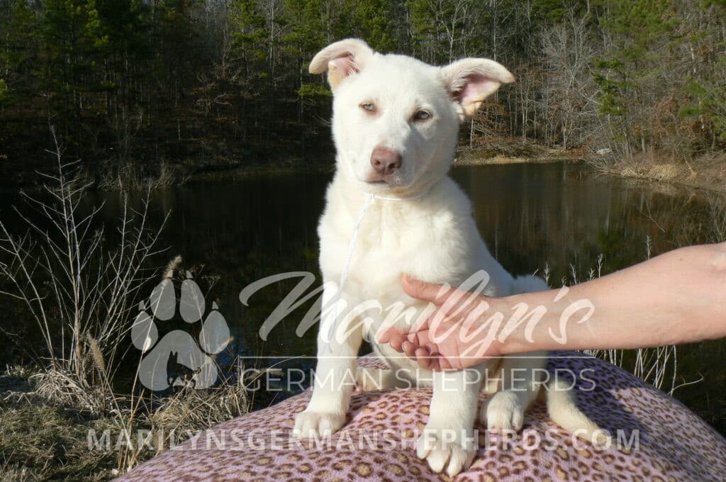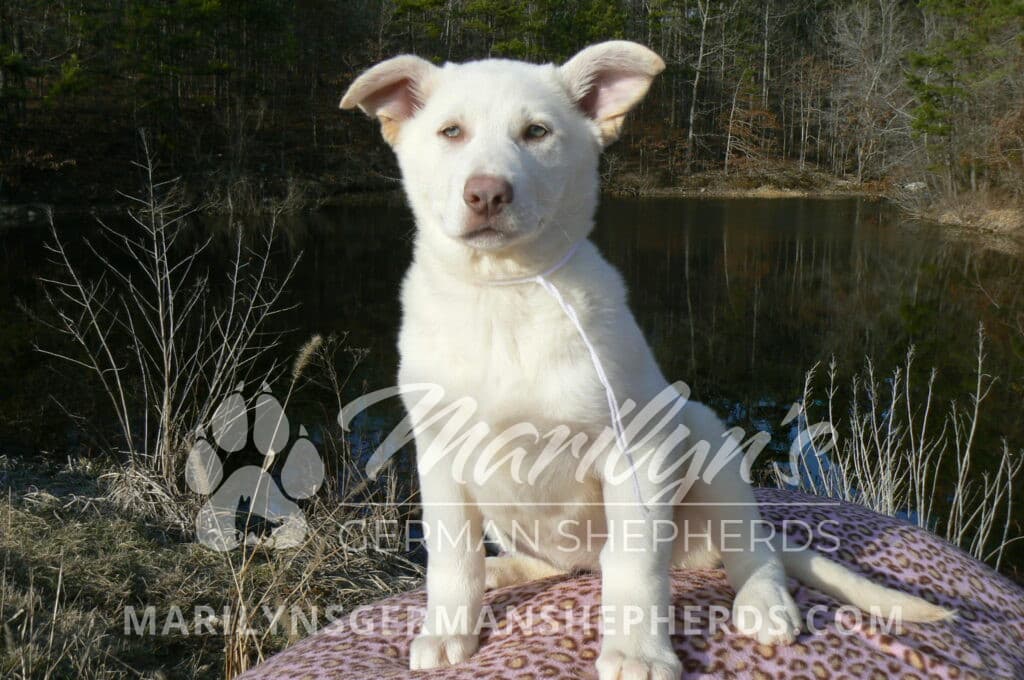 Goldie’s Miss Snowflakes and Cashmere is a beautiful rare snow white female puppy with blue eyes born 11-24-25, priced at $2150.00 with limited registration and a spay contract. PayPal Later is available for a puppy payment option. Her registration is AKC, American Kennel Club. She has a sweet calm personality. She has beautiful blue eyes. Her eyes will stay blue, or turn green, or be a light hazel color when she is an adult. She is actually a blue German Shepherd puppy in a white coat that is why she has blue eyes. She is a short coat puppy. She looks like a cute little polar bear cub romping around playing with her brothers and sisters. She is just too cute! She is very smart. She is a very friendly, loving puppy. She likes attention and likes to be picked up and loved on. She likes to be around people. She is a sweetheart that will brighten up each day. Her mother is Goldie, my blue fawn mom. Her father is Vanillabean Noel, my Isabella dad. The color Isabella is liver and blue together. She has a puppy replacement health guarantee on genetic issues until one year old. Her shots and wormings are up to date and she has been vet checked. She comes with 30 days of free pet insurance on accidents and illnesses, that the new pet owner must activate. After the free 30 days you can keep the pet insurance or it will self cancel. She can be reserved for you with a $200.00 non-refundable deposit. I accept puppy payment through Paypal, cash, credit card, PayPal Later or Venmo. She is available for puppy pick up now. She can be shipped. Shipping is $680.00 which includes crate, airfare and health certificate. I fly my puppies on Fridays. She will make an amazing new addition to your family.