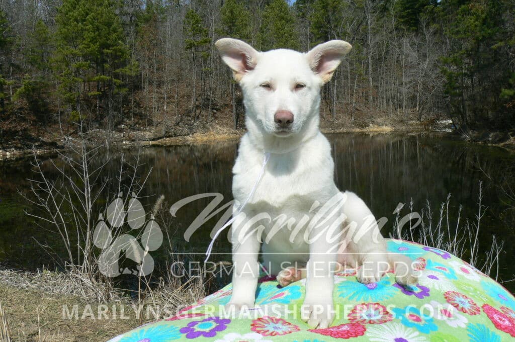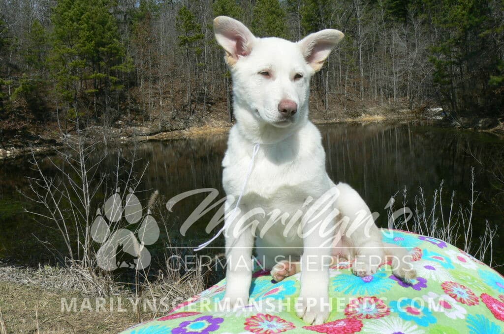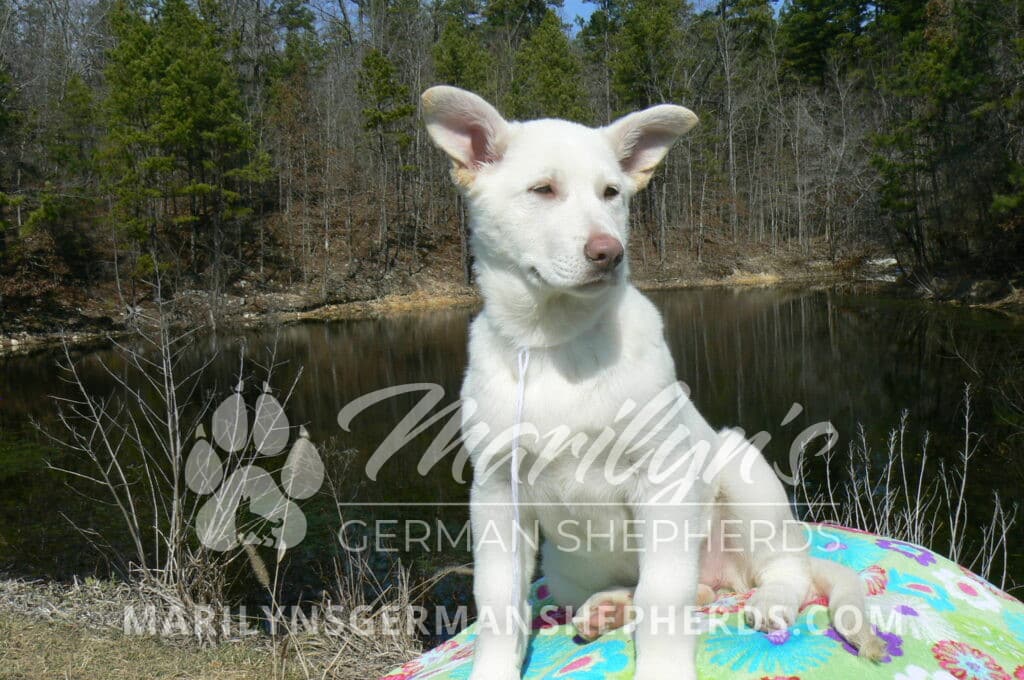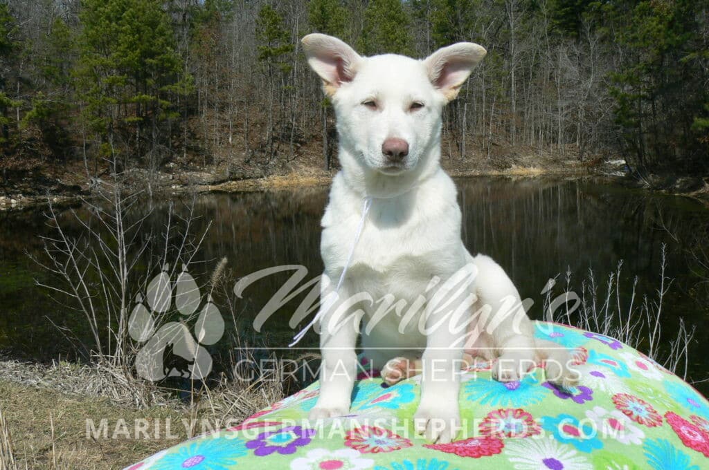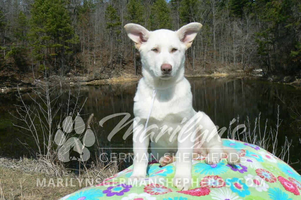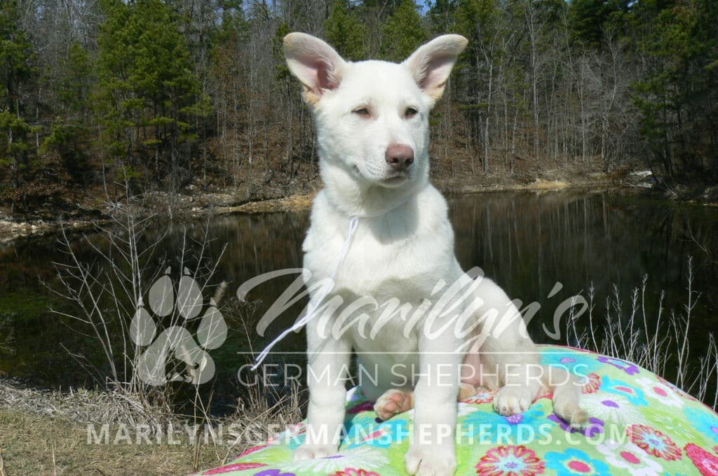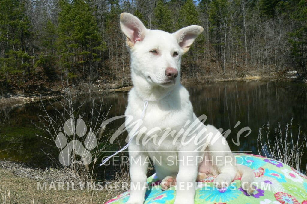Goldie’s Miss Snowflakes and Cashmere is a beautiful rare snow white female puppy with blue eyes born 11-24-25, priced at $2150.00 with limited registration and a spay contract. PayPal Later is available for a puppy payment option. Her registration is AKC, American Kennel Club. She has a sweet calm personality. She has beautiful blue eyes. Her eyes will stay blue, or turn green, or be a light hazel color when she is an adult. She is actually a blue German Shepherd puppy in a white coat that is why she has blue eyes. She is a short coat puppy. She looks like a cute little polar bear cub romping around playing with her brothers and sisters. She is just too cute! She is very smart. She is a very friendly, loving puppy. She likes attention and likes to be picked up and loved on. She likes to be around people. She is a sweetheart that will brighten up each day. Her mother is Goldie, my blue fawn mom. Her father is Vanillabean Noel, my Isabella dad. The color Isabella is liver and blue together. She has a puppy replacement health guarantee on genetic issues until one year old. Her shots and wormings are up to date and she has been vet checked. She comes with 30 days of free pet insurance on accidents and illnesses, that the new pet owner must activate. After the free 30 days you can keep the pet insurance or it will self cancel. She can be reserved for you with a $200.00 non-refundable deposit. I accept puppy payment through Paypal, cash, credit card, PayPal Later or Venmo. She is available for puppy pick up now. She can be shipped. Shipping is $680.00 which includes crate, airfare and health certificate. I fly my puppies on Fridays. She will make an amazing new addition to your family.