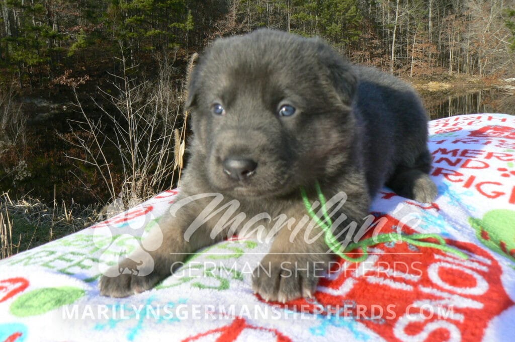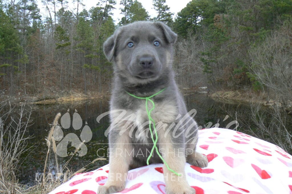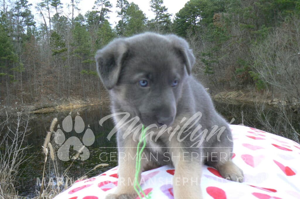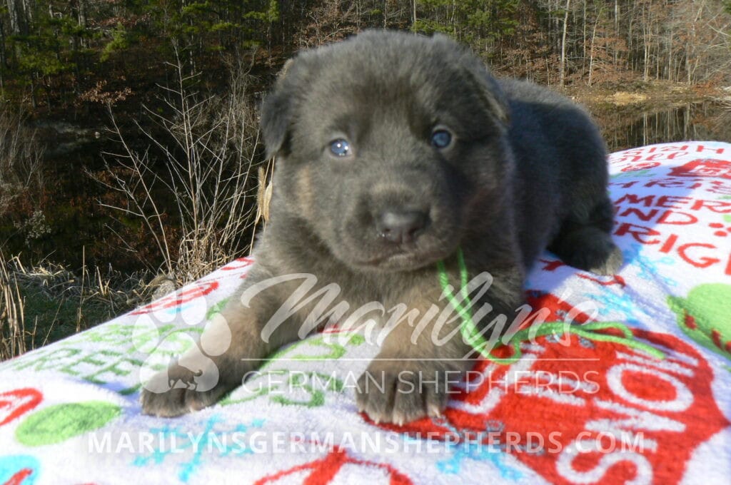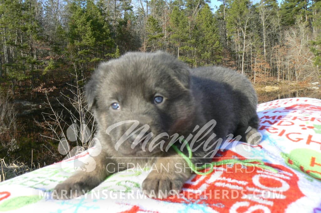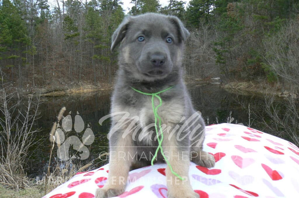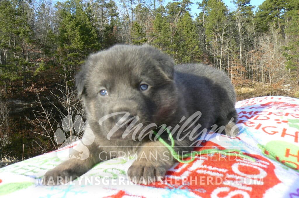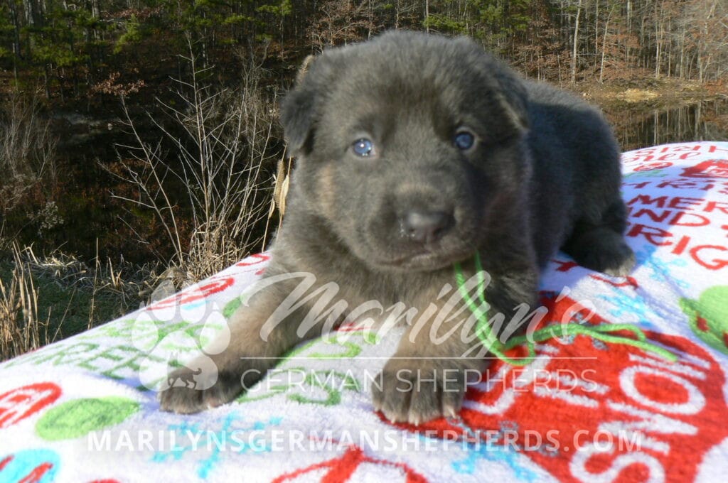 Goldie’s Mr. Toasted Pistachio is a blue and tan male puppy born 11-24-25, priced at $2150.00 with limited registration and a neuter contract. He has the option of PayPal Later payment plan through my website. His registration is AKC, American Kennel Club. He has a laidback personality. He has blue eyes. As an adult his eyes will stay blue or turn green or a gold hazel color. He is a very large boned puppy and will be a very big German Shepherd when he is an adult. He is a very friendly puppy. He enjoys attention. He likes to play with his litter mates. He has a soft short coat. He will keep the blue mask on his face when he is an adult and be saddled down his back with the blue. The color blue in a German Shepherd is a soft gray color. He is very alert and smart. He likes to be with people. He is an awesome puppy. His mother is Goldie, my blue fawn mom. His father is Vanillabean Noel, my Isabella dad. The color Isabella is liver and blue together. He has a puppy replacement health guarantee on genetic issues until one year old. His shots and wormings are up to date and he has been vet checked. He comes with 30 days of pet insurance free for accidents and illnesses, that the new pet owner must activate. After the free 30 days you can keep the pet insurance or it will self cancel. He can be reserved for you with a $200.00 non-refundable deposit. I accept puppy payment through Paypal, cash, credit card, or Venmo. He is available for puppy pick up January 19th. He can be shipped. Shipping is an additional cost of $680.00 which includes crate, airfare, and health certificate. I fly my puppies on Fridays. He will make an amazing new addition to your family.