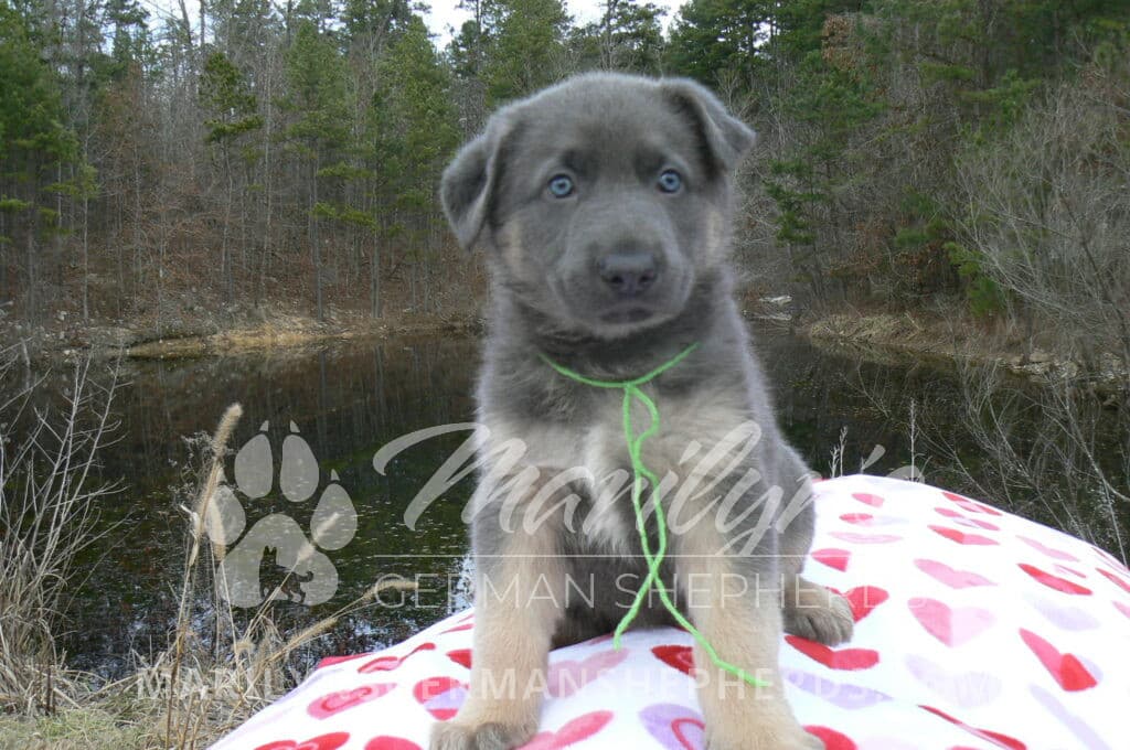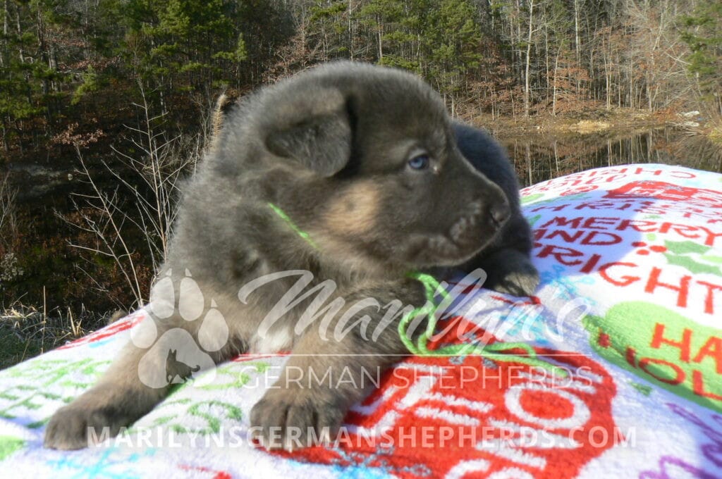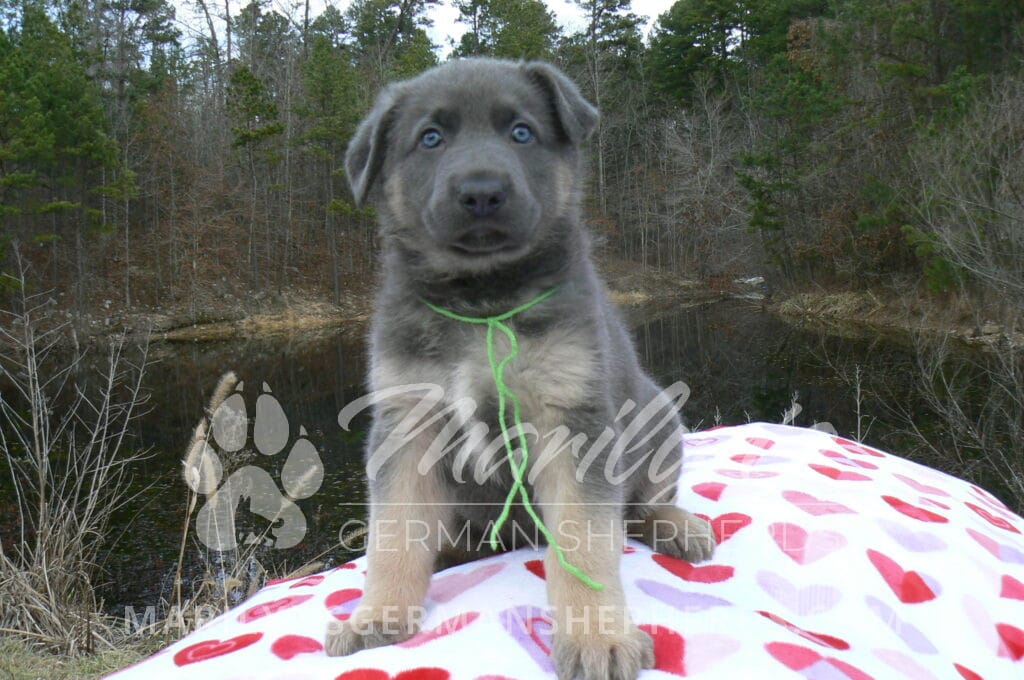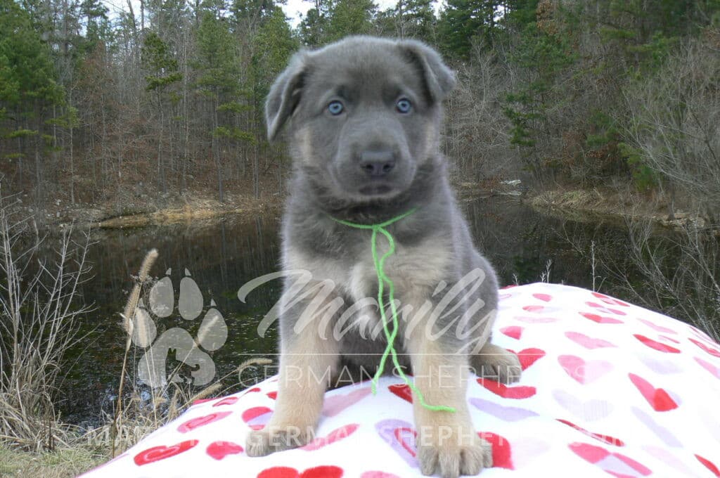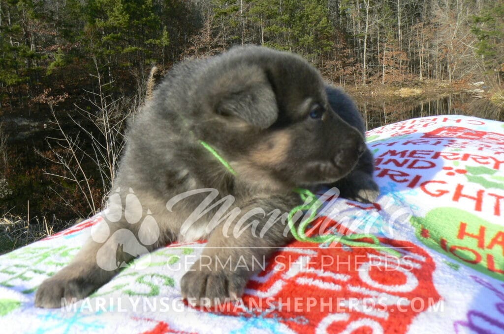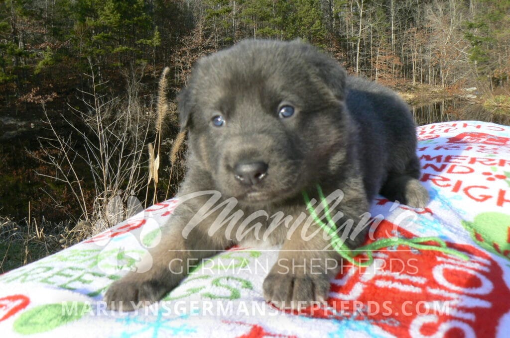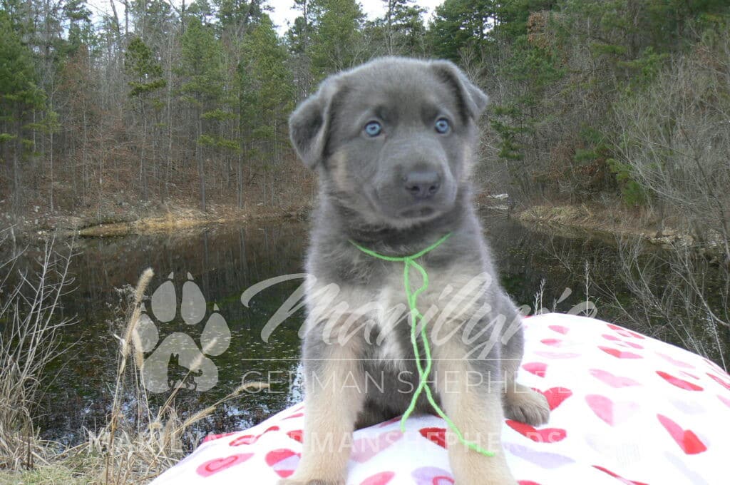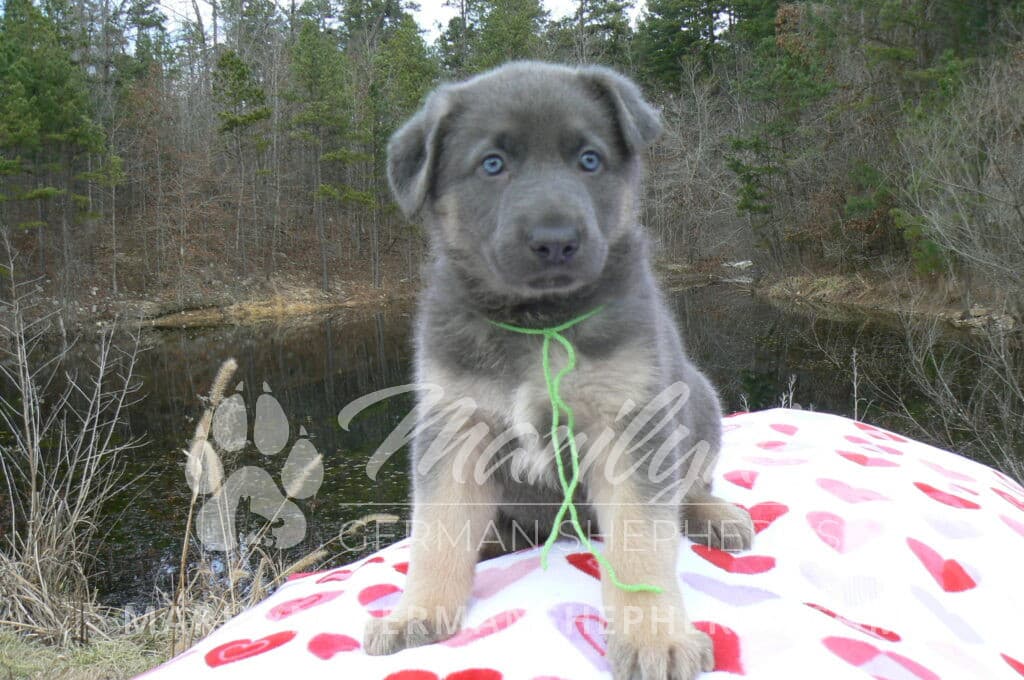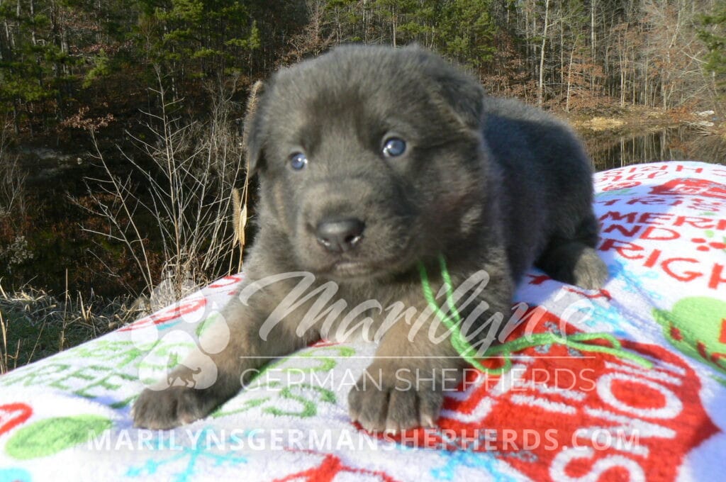 Goldie’s Mr. Toasted Pistachio is a blue and tan male puppy born 11-24-25, priced at $2150.00 with limited registration and a neuter contract. He has the option of PayPal Later payment plan through my website. His registration is AKC, American Kennel Club. He has a laidback personality. He has blue eyes. As an adult his eyes will stay blue or turn green or a gold hazel color. He is a very large boned puppy and will be a very big German Shepherd when he is an adult. He is a very friendly puppy. He enjoys attention. He likes to play with his litter mates. He has a soft short coat. He will keep the blue mask on his face when he is an adult and be saddled down his back with the blue. The color blue in a German Shepherd is a soft gray color. He is very alert and smart. He likes to be with people. He is an awesome puppy. His mother is Goldie, my blue fawn mom. His father is Vanillabean Noel, my Isabella dad. The color Isabella is liver and blue together. He has a puppy replacement health guarantee on genetic issues until one year old. His shots and wormings are up to date and he has been vet checked. He comes with 30 days of pet insurance free for accidents and illnesses, that the new pet owner must activate. After the free 30 days you can keep the pet insurance or it will self cancel. He can be reserved for you with a $200.00 non-refundable deposit. I accept puppy payment through Paypal, cash, credit card, or Venmo. He is available for puppy pick up January 19th. He can be shipped. Shipping is an additional cost of $680.00 which includes crate, airfare, and health certificate. I fly my puppies on Fridays. He will make an amazing new addition to your family.
