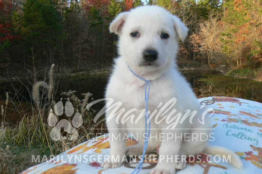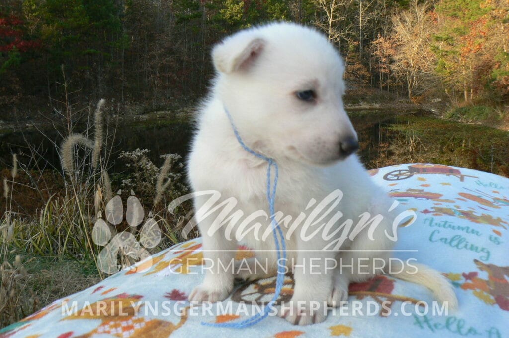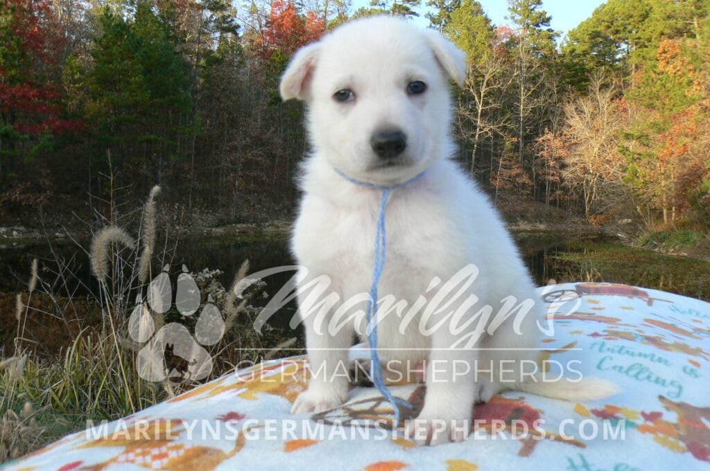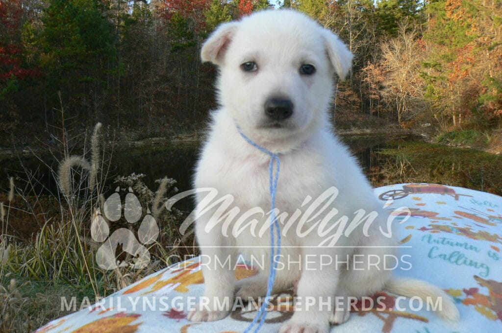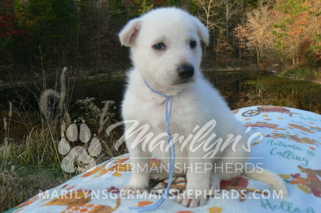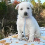 Ice Princess’s Mr. Frozen Lake is a white male puppy with blue eyes, born 10-10-25, priced at $1850.00 with limited registration and a neuter contract. He has the option of PayPal Later payment plan through my website. His registration is UKC, Universal Kennel Club. He has the sweetest personality. He is a littlest puppy in this litter. He manages to get a little extra attention. He likes to cuddle. He has blue eyes. As an adult his eyes will stay blue or turn green or a gold hazel color. He is really a blue German Shepherd in a white coat that is why he has blue eyes. He is a short coat puppy. He enjoys romping and playing with his litter mates. He looks like a little polar bear cub playing. It is too sweet! He is a very friendly puppy. He enjoys being picked up and loved on. He is very alert and smart. He likes to be around people. He is a puppy that will warm your heart and have you smiling everyday. His mother is Ice Princess my white mom. His father is Vanillabean Noel, my Isabella dad. The color Isabella is liver and blue together. He has a puppy replacement health guarantee on genetic issues until one year old. His shots and wormings are up to date and he has been vet checked. He comes with 30 days of pet insurance free for accidents and illnesses, that the new pet owner must activate. After the free 30 days you can keep the pet insurance or it will self cancel. He can be reserved for you with a $200.00 non-refundable deposit. I accept puppy payment through Paypal, cash, credit card, or Venmo. He is available for puppy pick up December 5th. He can be shipped. Shipping is an additional cost of $680.00 which includes crate, airfare, and health certificate. I fly my puppies on Fridays. He will make an amazing new addition to your family.