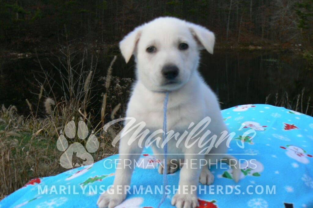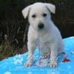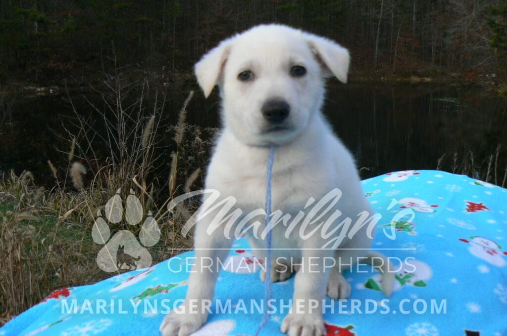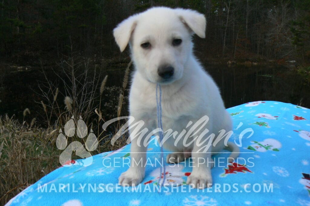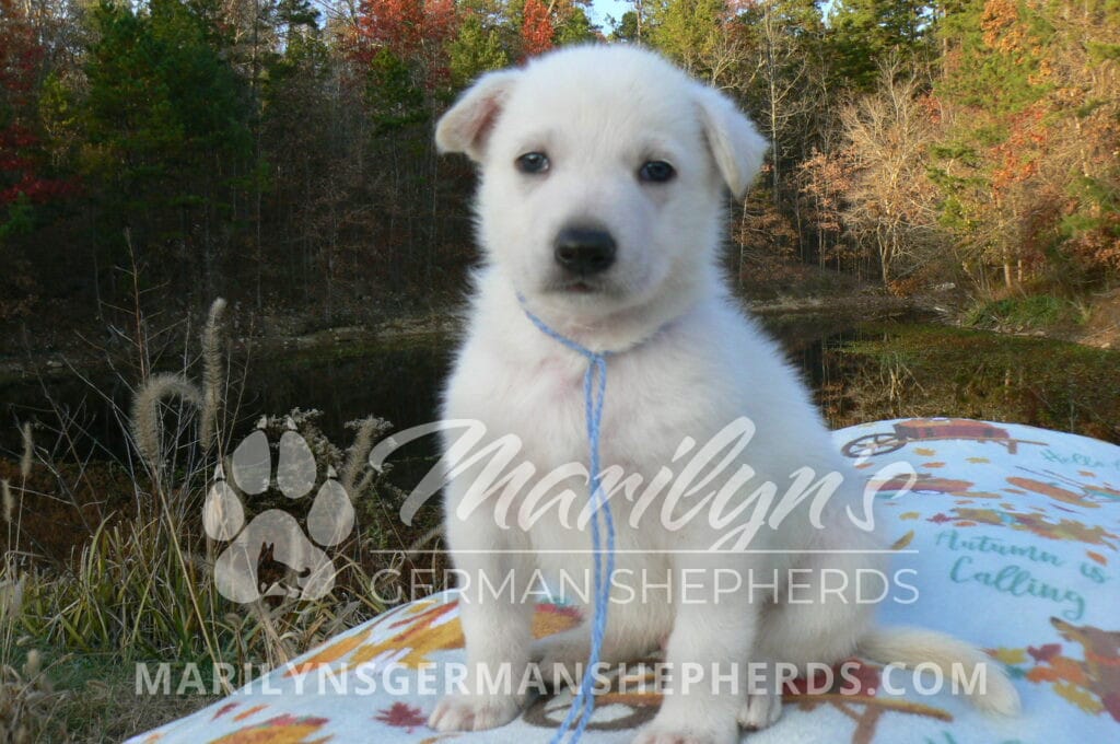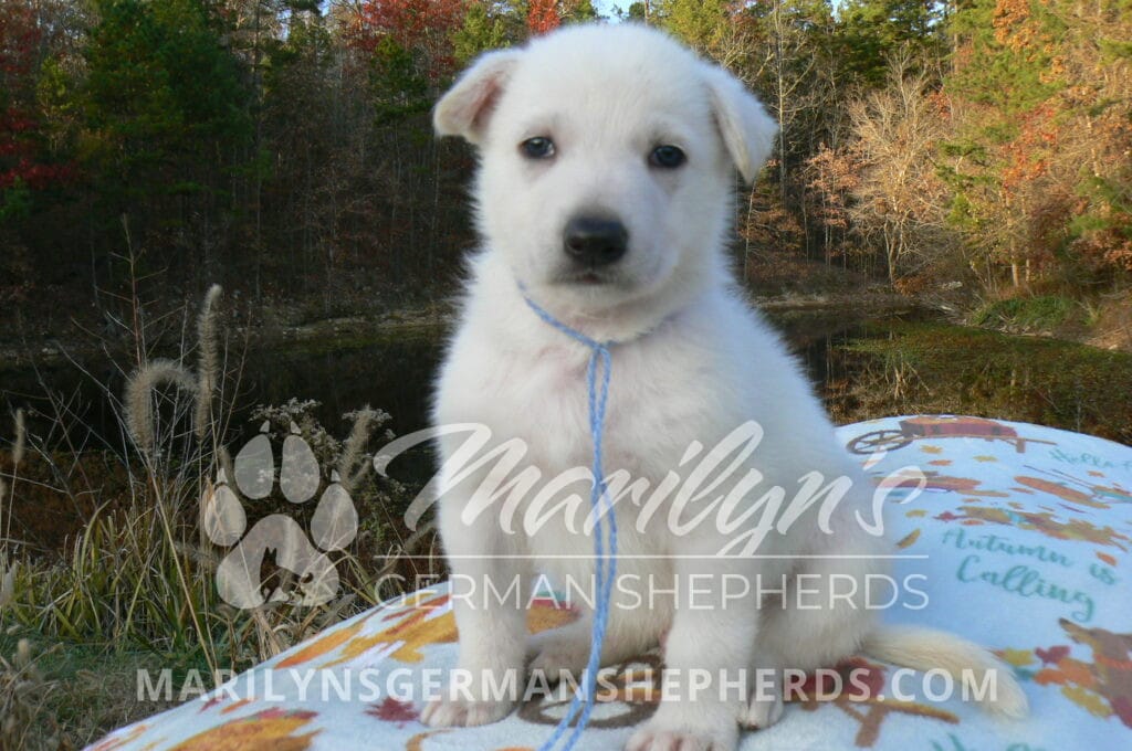 Ice Princess’s Mr. Frozen Lake is a white male puppy with blue eyes, born 10-10-25, priced at $1850.00 with limited registration and a neuter contract. He has the option of PayPal Later payment plan through my website. His registration is UKC, Universal Kennel Club. He has the sweetest personality. He is a littlest puppy in this litter. He manages to get a little extra attention. He likes to cuddle. He has blue eyes. As an adult his eyes will stay blue or turn green or a gold hazel color. He is really a blue German Shepherd in a white coat that is why he has blue eyes. He is a short coat puppy. He enjoys romping and playing with his litter mates. He looks like a little polar bear cub playing. It is too sweet! He is a very friendly puppy. He enjoys being picked up and loved on. He is very alert and smart. He likes to be around people. He is a puppy that will warm your heart and have you smiling everyday. His mother is Ice Princess my white mom. His father is Vanillabean Noel, my Isabella dad. The color Isabella is liver and blue together. He has a puppy replacement health guarantee on genetic issues until one year old. His shots and wormings are up to date and he has been vet checked. He comes with 30 days of pet insurance free for accidents and illnesses, that the new pet owner must activate. After the free 30 days you can keep the pet insurance or it will self cancel. He can be reserved for you with a $200.00 non-refundable deposit. I accept puppy payment through Paypal, cash, credit card, or Venmo. He is available for puppy pick up December 5th. He can be shipped. Shipping is an additional cost of $680.00 which includes crate, airfare, and health certificate. I fly my puppies on Fridays. He will make an amazing new addition to your family.