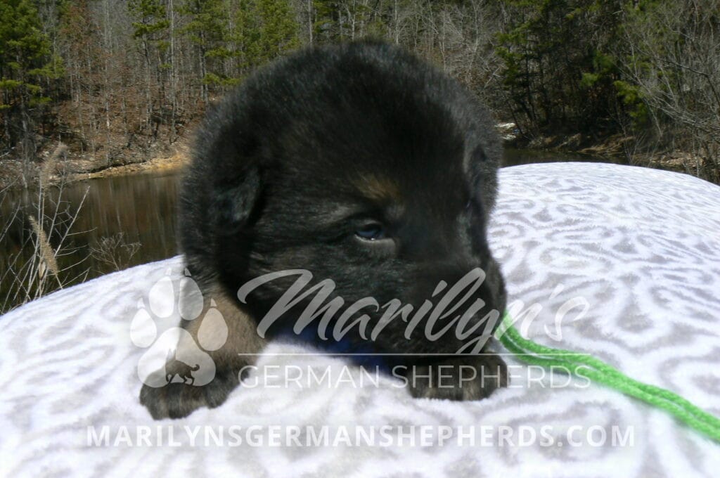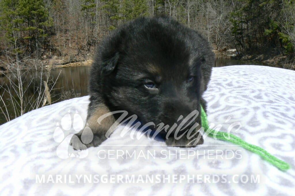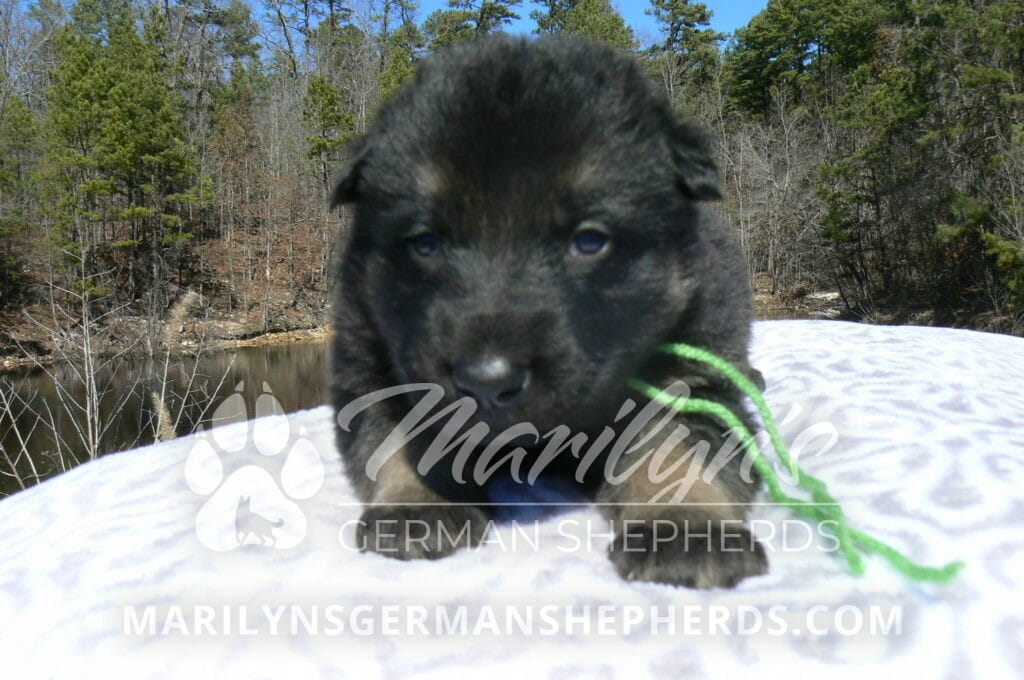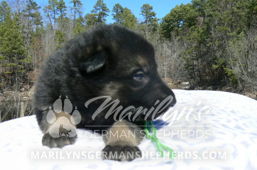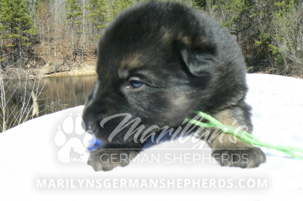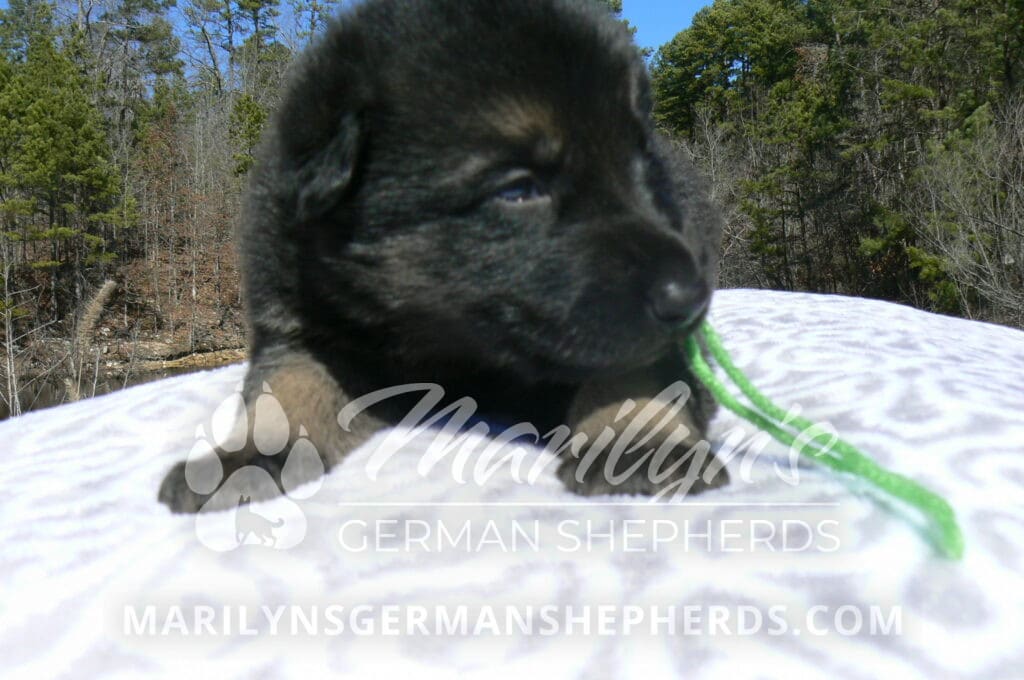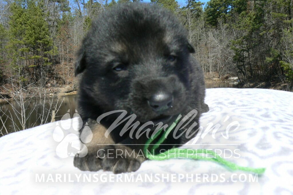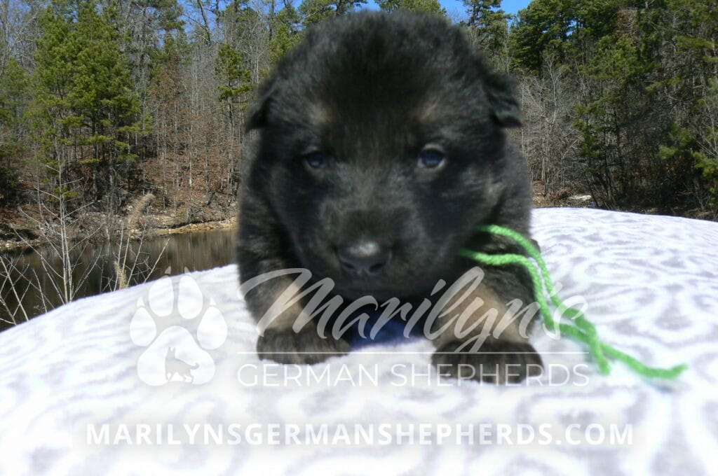 Midnight Illusion’s Miss Sweet Kiwi and Starfruit is a beautiful black and tan female puppy, born 2-5-26, priced at $1850.00 with limited registration and a spay contract. PayPal Later is available for a puppy payment option. Her registration is AKC, American Kennel Club. She has a kind personality. She is a snuggler. She will have the classic German Shepherd look. She is a short coat black and tan puppy. She will keep the black mask on her face when she is an adult. She likes playing with her litter mates. She is very smart. She is a very friendly, loving puppy. She likes attention and likes to be picked up and loved on. She enjoyed being with people. She will bring love to you everyday. Her mother is Midnight Illusion, one of my black moms. Her father is Vanillabean Noel, my Isabella dad. The color Isabella is liver and blue together. She has a puppy replacement health guarantee on genetic issues until one year old. Her shots and wormings are up to date and she has been vet checked. She comes with 30 days of free pet insurance on accidents and illnesses, that the new pet owner must activate. After the free 30 days you can keep the pet insurance or it will self cancel. She can be reserved for you with a $200.00 non-refundable deposit. I accept puppy payment through Paypal, cash, credit card, PayPal Later or Venmo. She is available for puppy pick up April 2nd. She can be shipped. Shipping is $680.00 which includes crate, airfare and health certificate. I fly my puppies on Fridays. She will make an amazing new addition to your family.